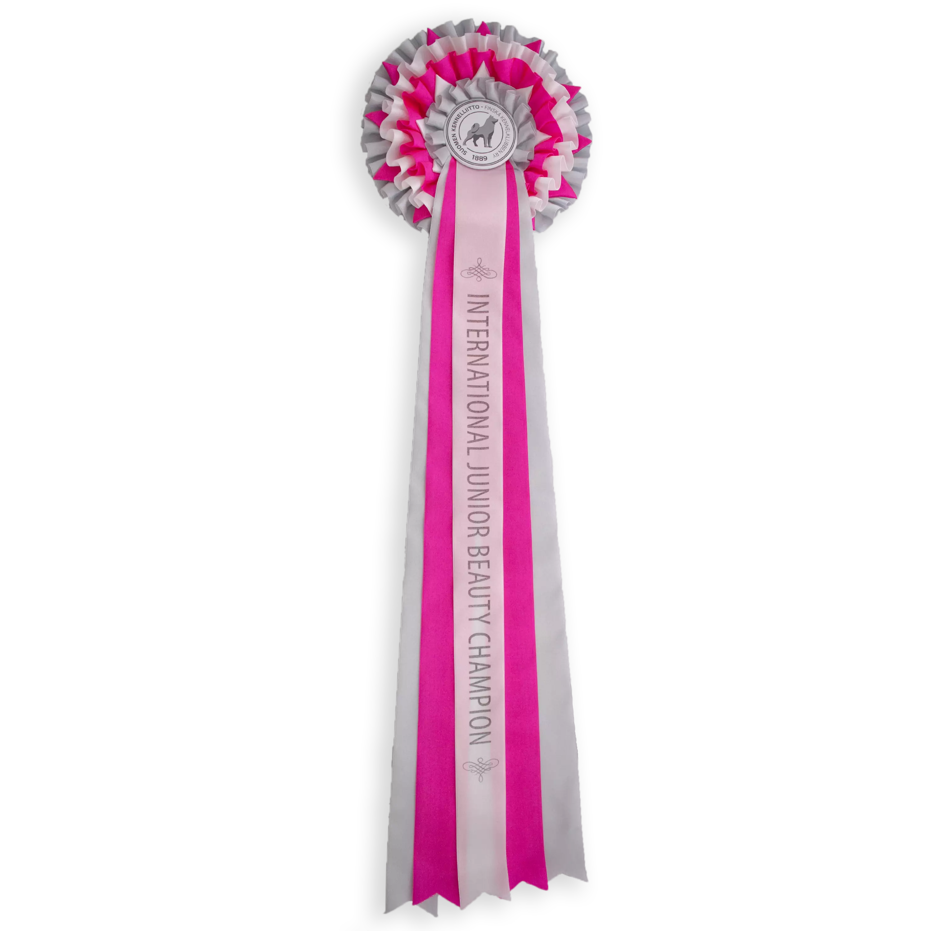 International Junior Beauty CH ruusuke on saanut uuden ihastuttavan mallin! Kansainvälinen juniorimuotovalion ruusuke on halkaisijaltaan noin 18,5 cm ja siinä on 5 nauhaa, joiden pituus on noin 56 cm. Ruusukkeen takana on koukkukiinnitys. Metallisessa keskiössä on Kennelliiton logopainatus.