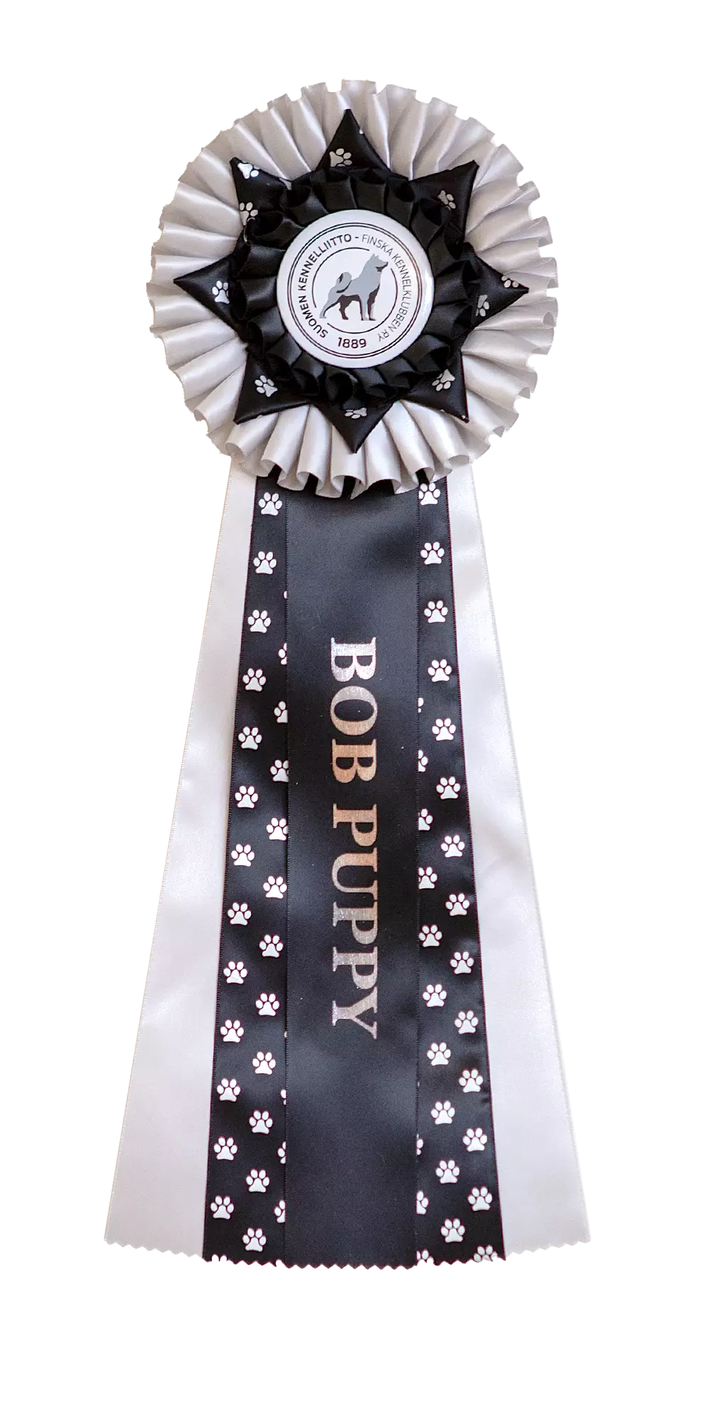 BOB Puppy -ruusuke ihanalla tassunauhalla. Ruusukkeen halkaisija on leveimmillään noin 14,5 cm ja kokonaispituus on noin 44 cm.