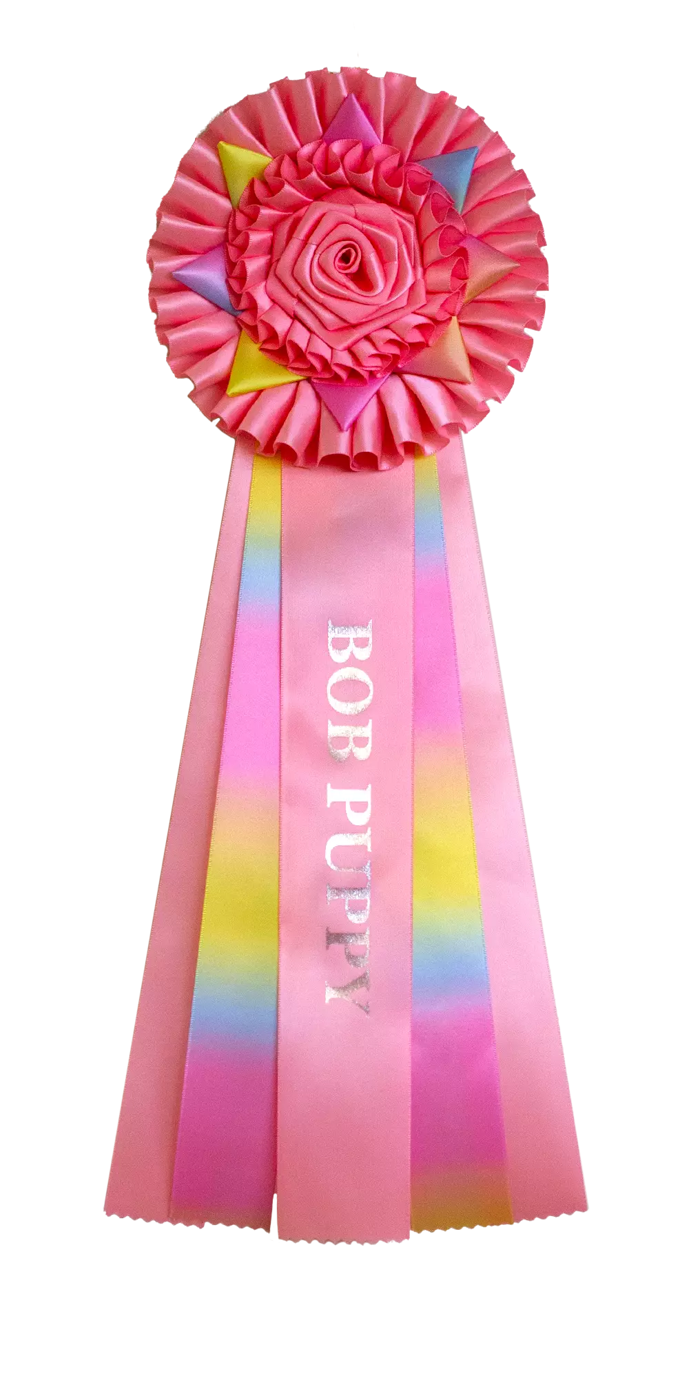 Ihana pinkki BOB Puppy -ruusuke ihanalla sateenkaarinauhalla. Ruusukkeen halkaisija on leveimmillään noin 14,5 cm ja kokonaispituus on noin 44 cm.