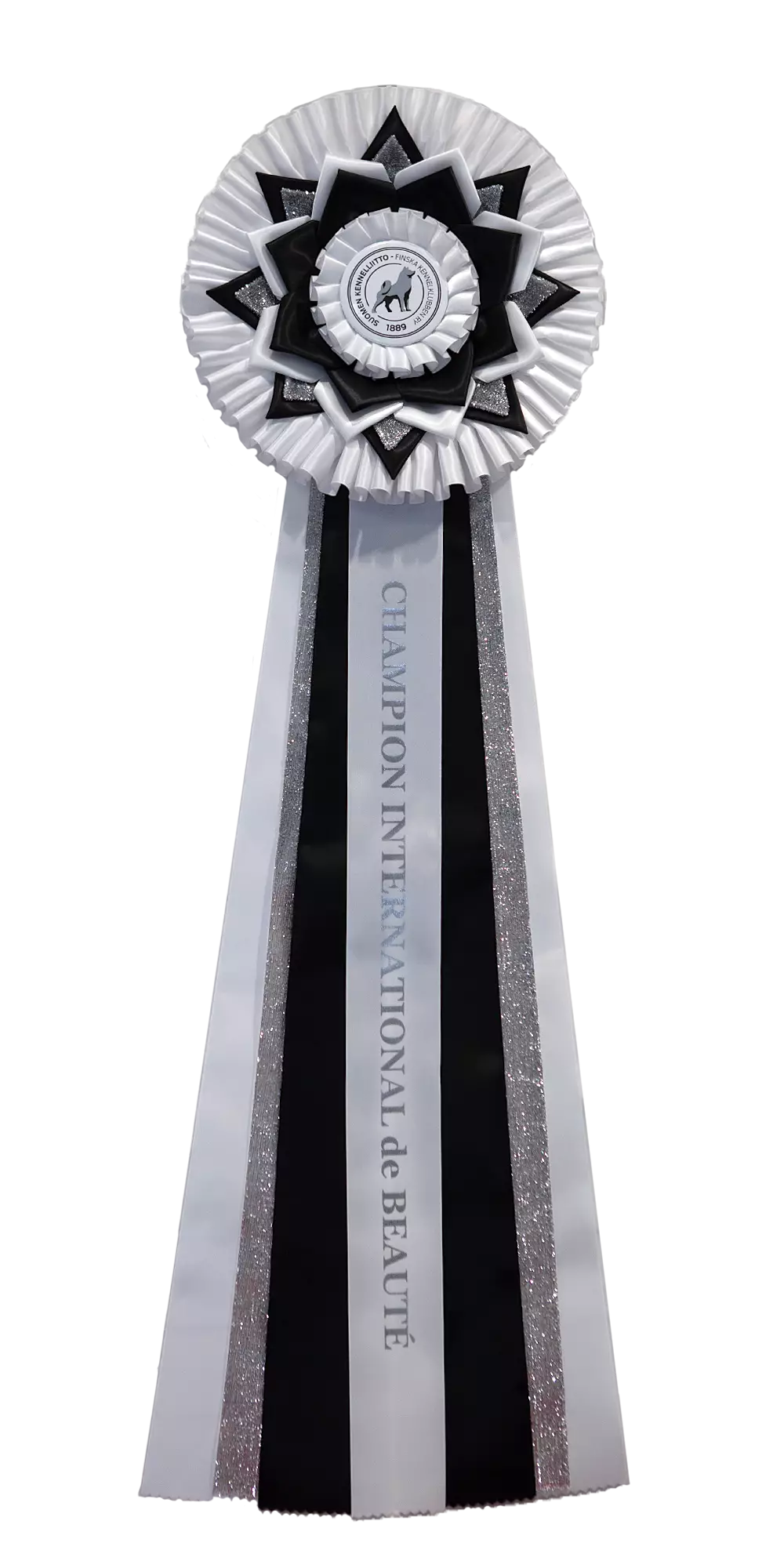Upea glitterinhohtoinen CHAMPION INTERNATIONAL DE BEAUTÉ ruusuke. Keskiössä on Kennellitton logo. Ruusukkeen halkaisija on noin 22 cm ja kokonaispituus noin 73 cm.