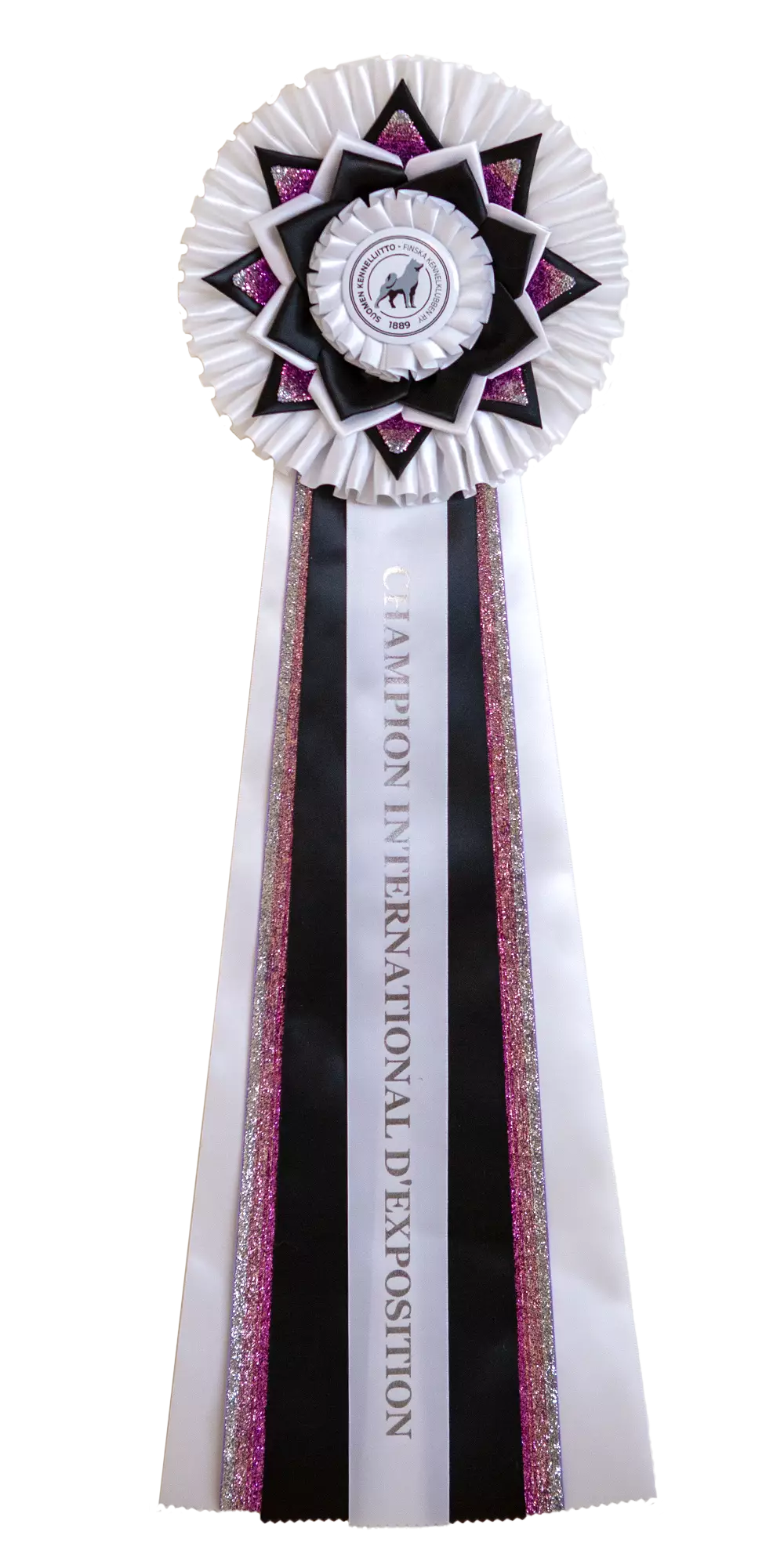 Upea glitterinhohtoinen CHAMPION INTERNATIONAL D'EXPOSITION -ruusuke. Keskiössä on Kennellitton logo. Ruusukkeen halkaisija on noin 22 cm ja kokonaispituus noin 73 cm.
