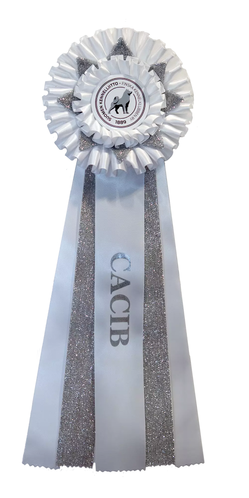 CACIB-ruusuke glitternauhalla. Ruusukkeen halkaisija on leveimmillään noin 14,5 cm ja kokonaispituus on noin 44 cm.