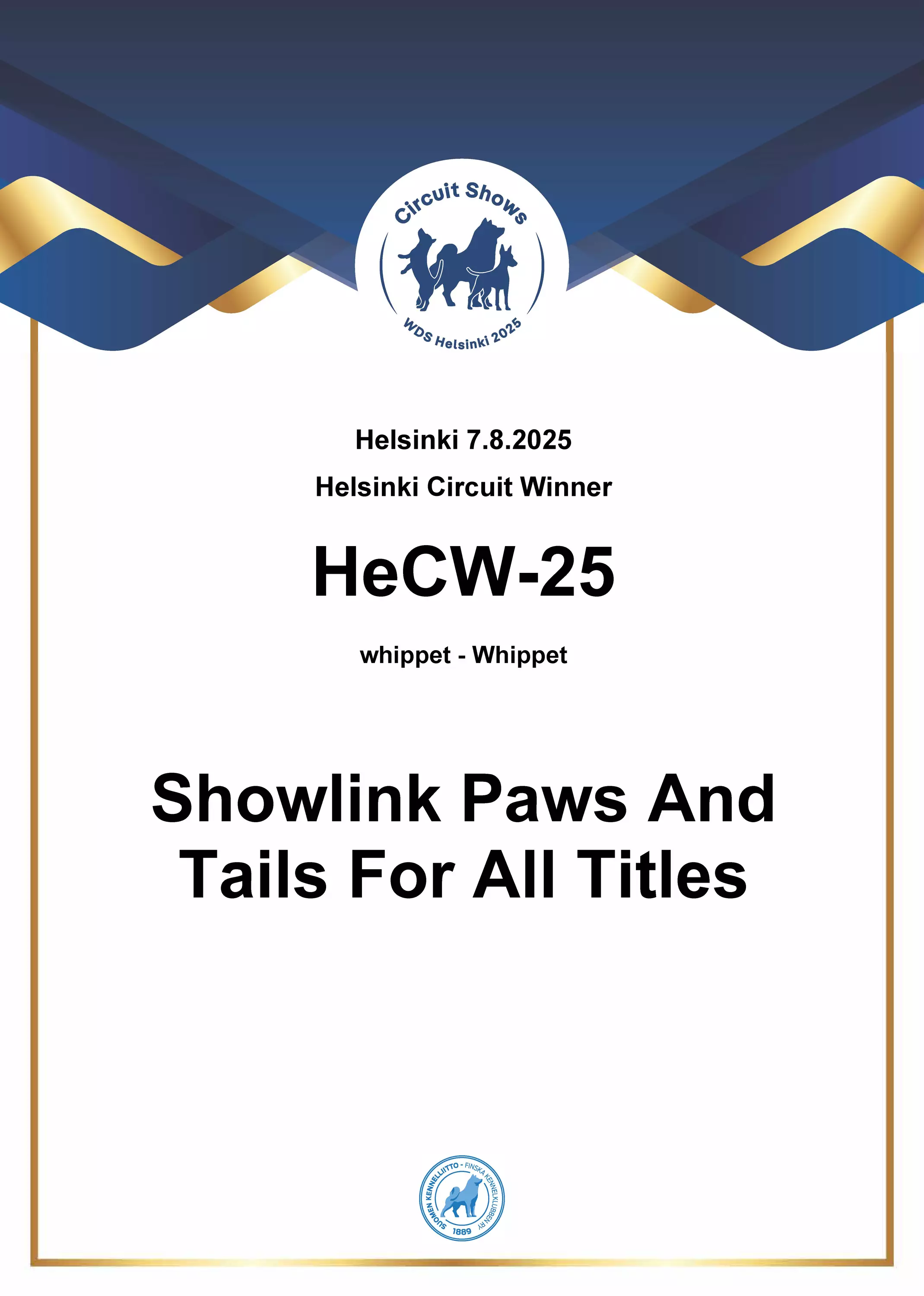 Ihana Circuit 2025 diplomi muistoksi. Kirjoita koiran virallinen nimi ja kilpailunumero tai haluamasi titteli/tittelit tilauksen lopussa olevaan lisätietokenttään. Mikäli tilaat samalla kertaa useamman diplomin, niin erittelethän tulostettavat tekstit selkeästi. Tuote annetaan postin kuljetettavaksi noin 7 arkipäivän kuluessa tilauksesta.