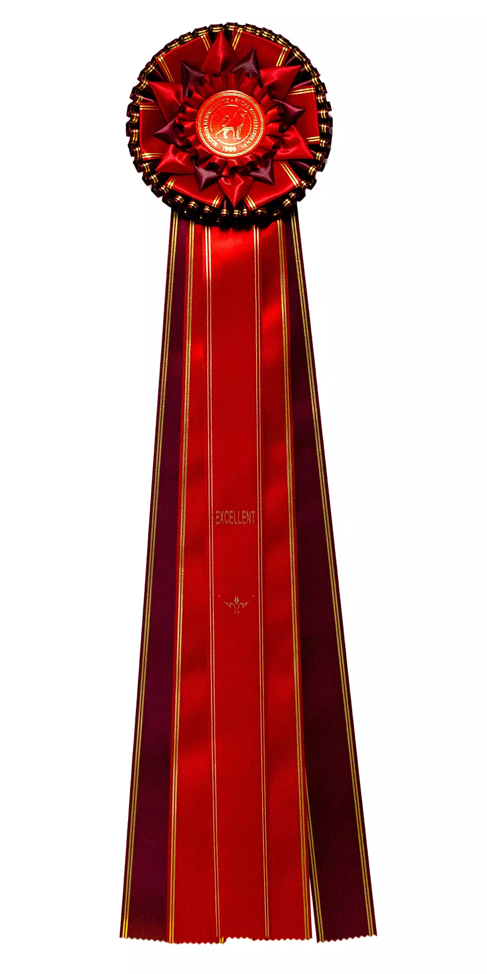 Punaisen sävyissä hehkuva iso EXCELLENT ruusuke. Ruusukkeen materiaali napakka, kiiltävä silkki. Takana koukkukiinnitys. Keskiössä Kennelliiton logo.
