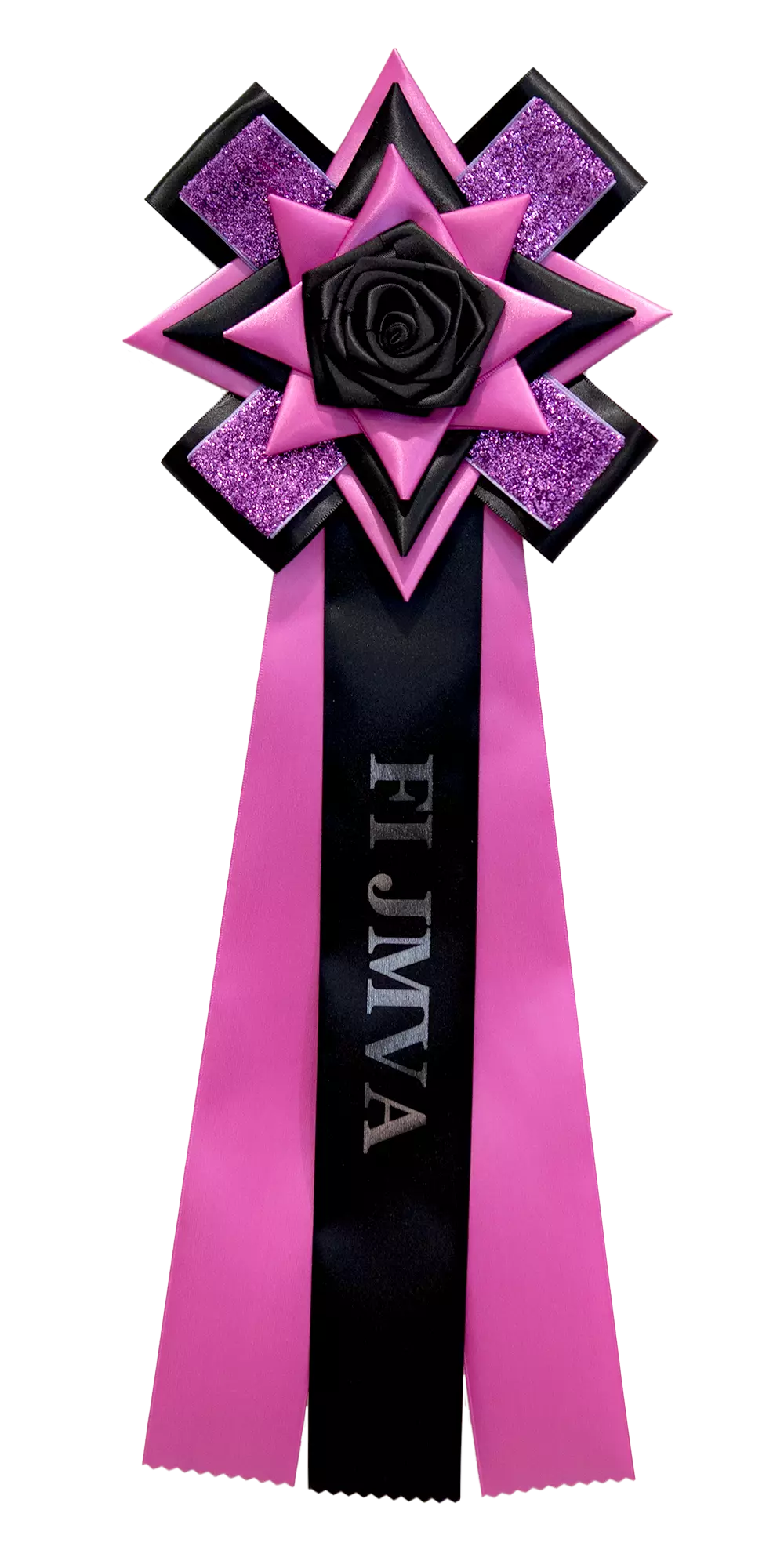 Nyt saatavilla glitterin hohtoisia FI JMVA -ruusukeita! Ruusukkeen halkaisija on leveimmillään noin 17 cm ja kokonaispituus on noin 46 cm.