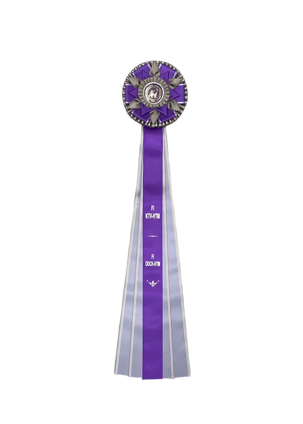 FI KTV-HTM - Suomen koiratanssivalio - Heelwork to Music ruusuke. Ruusukkeen halkaisija on noin 16 cm ja siinä on 5 nauhaa. Nauhoissa teksti FI KTV-HTM - FI DDCH-HTM. Takana koukkukiinnitys. Keskiössä Kennelliiton logo.