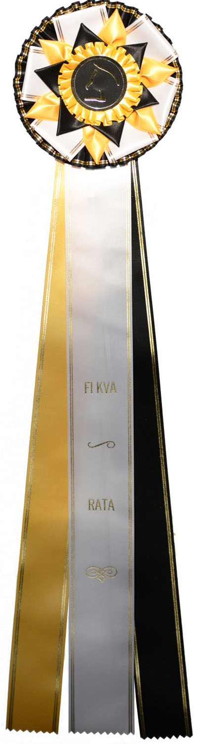 Upea FI KVA Rata - Suomen käyttövalio rata ruusuke. Halkaisija 16 cm ja 3 nauhaa, joiden pituus 57 cm. Nauhoissa teksti FI KVA Rata. Ruusukkeen materiaali napakka, kiiltävä silkki. Takana koukkukiinnitys. Keskiössä Kennelliiton logo.