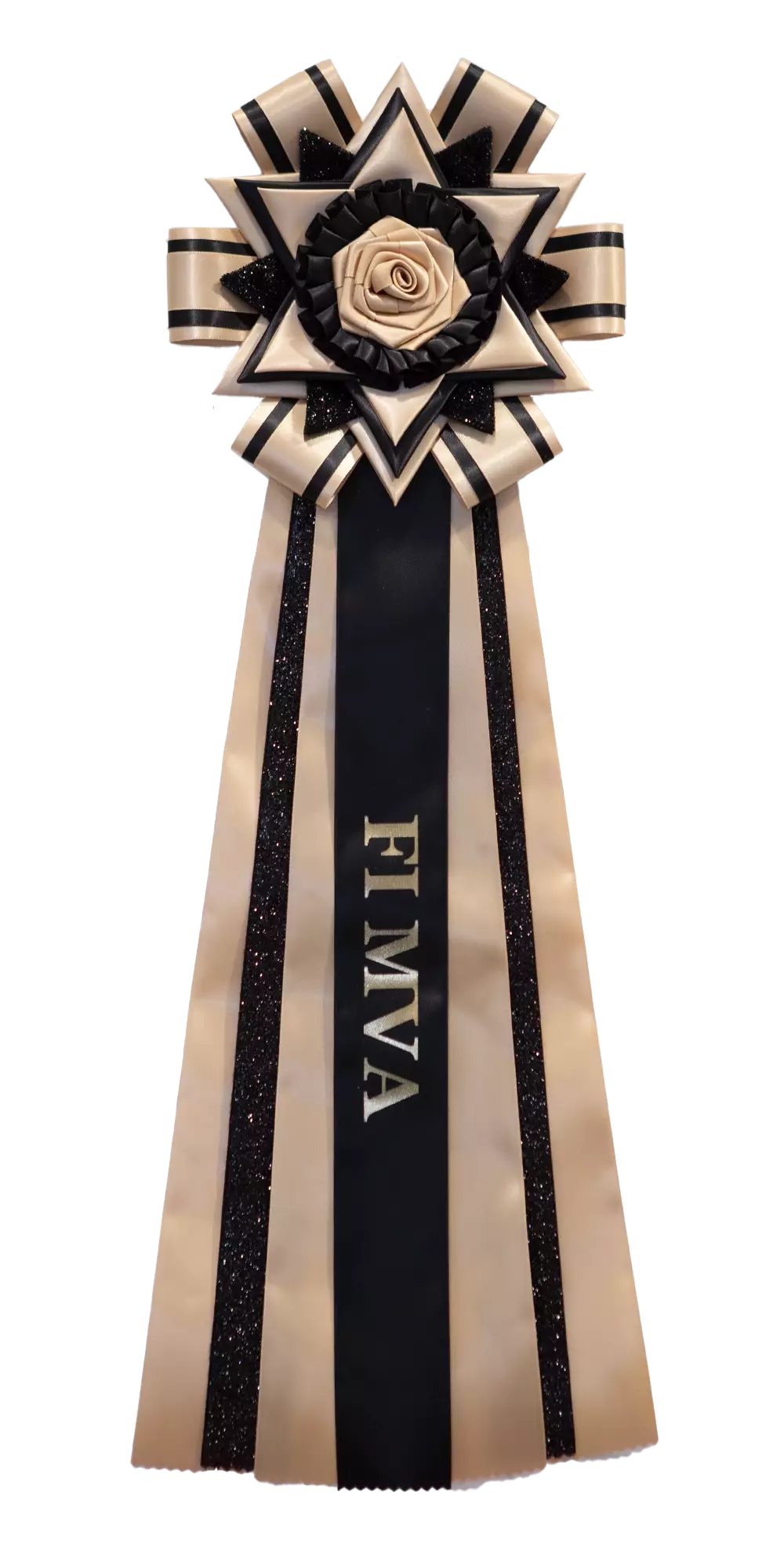 Uusi hieman kukkaa muistuttava FI MVA -ruusukemalli. Ruusukkeessa oleva musta glitternauha tuo ripauksen hohtoa ruusukkeeseen. Kukkaosan halkaisija on leveimmillään noin 21 cm ja kokonaispituus on noin 61 cm.