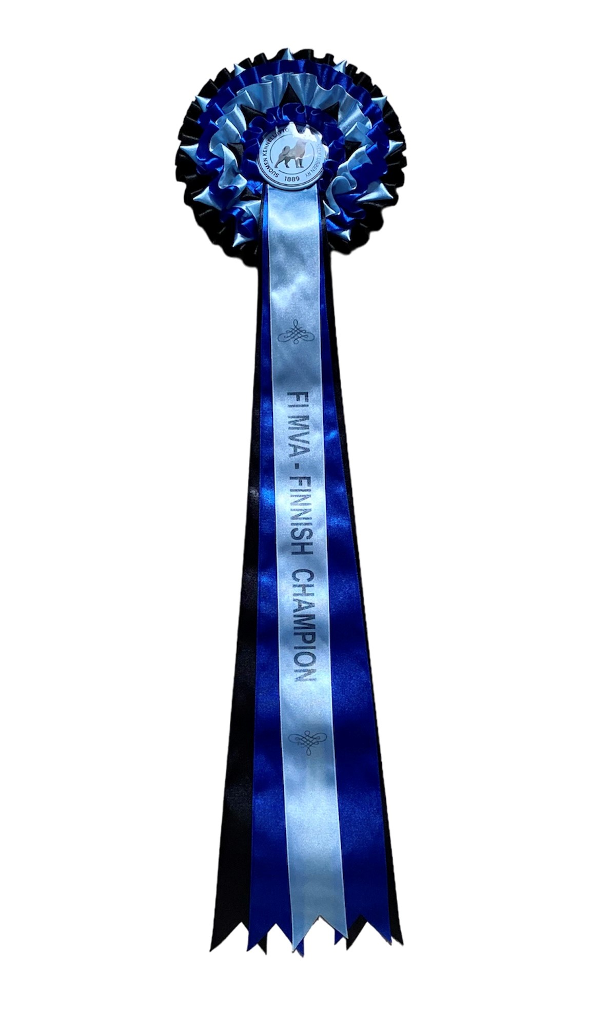 FI MVA - Suomen muotovalio ruusuke. Halkaisija noin 18,5 cm ja viisi nauhaa, joiden pituus on noin 56 cm. Nauhoissa teksti FI MVA, FINNISH CHAMPION. Ruusukkeen takana on koukkukiinnitys. Metallisessa keskiössä on Kennelliiton logopainatus.