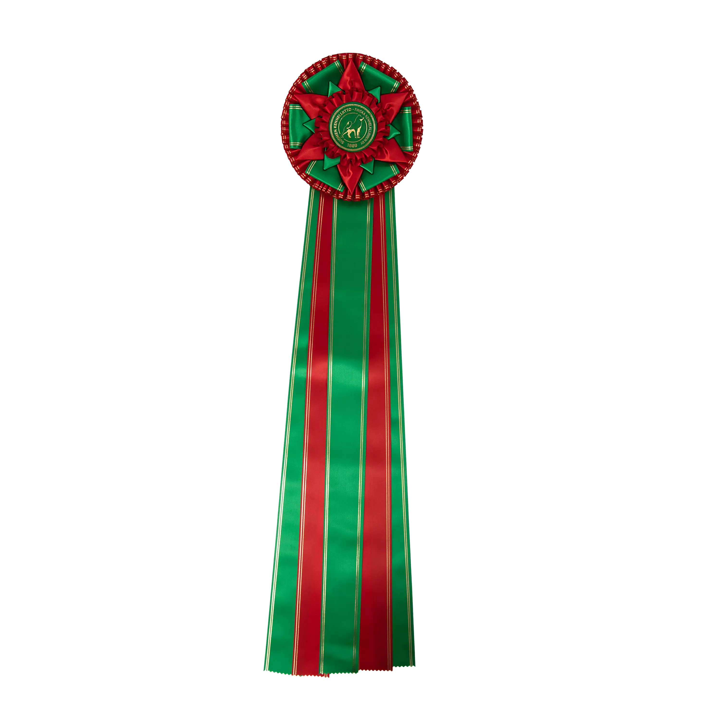 Upea Suomen muotovalioruusuke omalla kullanvärisellä painatuksella. Keskiössä Suomen Kennelliiton pyöreä logo kultaisella painatuksella. Oman tekstin maksimipituus on 60 merkkiä jaettuna viidelle riville. Yhden rivin maksimi merkkimäärä on 12. Kirjoita haluamasi teksti tilauksen "Lisätietoja"- tai toimituksen yhteydessä oleva "vapaamuotoinen viesti tilaukseesi liittyen"- kenttään ja jaa teksti eri riveille /- merkin avulla. Muista, että ruusukkeessa ei ole valmiina valiopainatusta (FI MVA / FI CH / Suomen muotovalio / Finnish champion), joten huomioi merkki- ja rivimäärissä ne. HUOM ! Painatus tehdään vain päällimmäiseen nauhaan. Muista kertoa myös missä muodossa haluat "valiotekstin". Ruusukkeen toimitusaika noin 2 viikkoa!