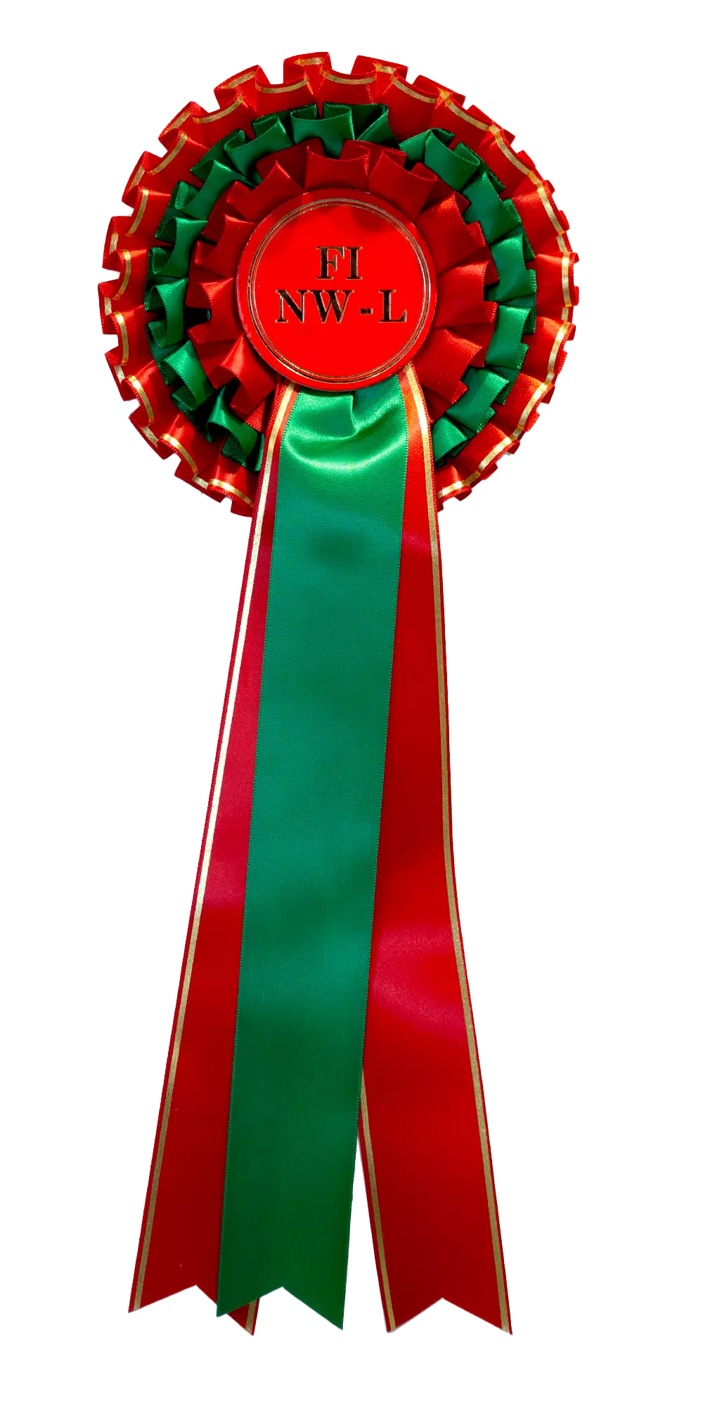 FI NW-L -ruusuke. Ruusukkeen halkaisija on noin 14,5 cm ja siitä laskeutuu kolme nauhaa, joiden pituus on noin 28 cm.
