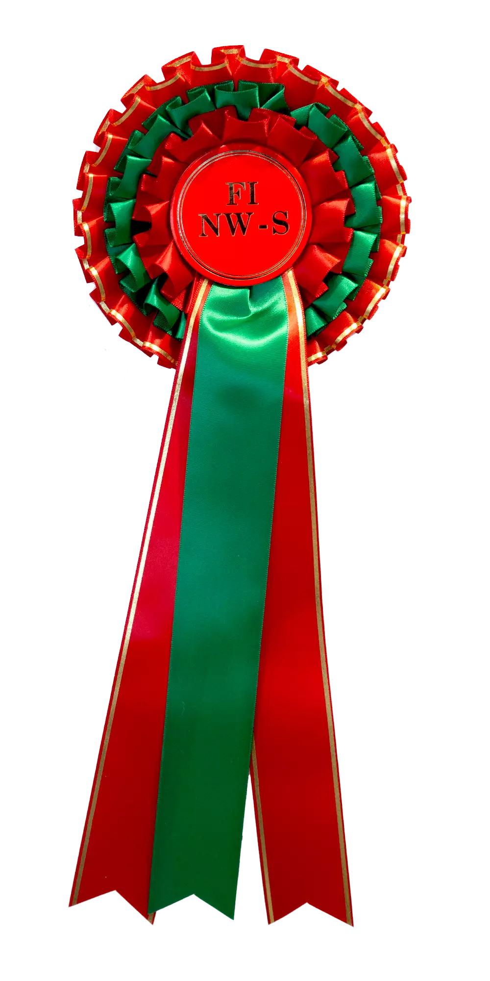 FI NW-S -ruusuke. Ruusukkeen halkaisija on noin 14,5 cm ja siitä laskeutuu kolme nauhaa, joiden pituus on noin 28 cm.