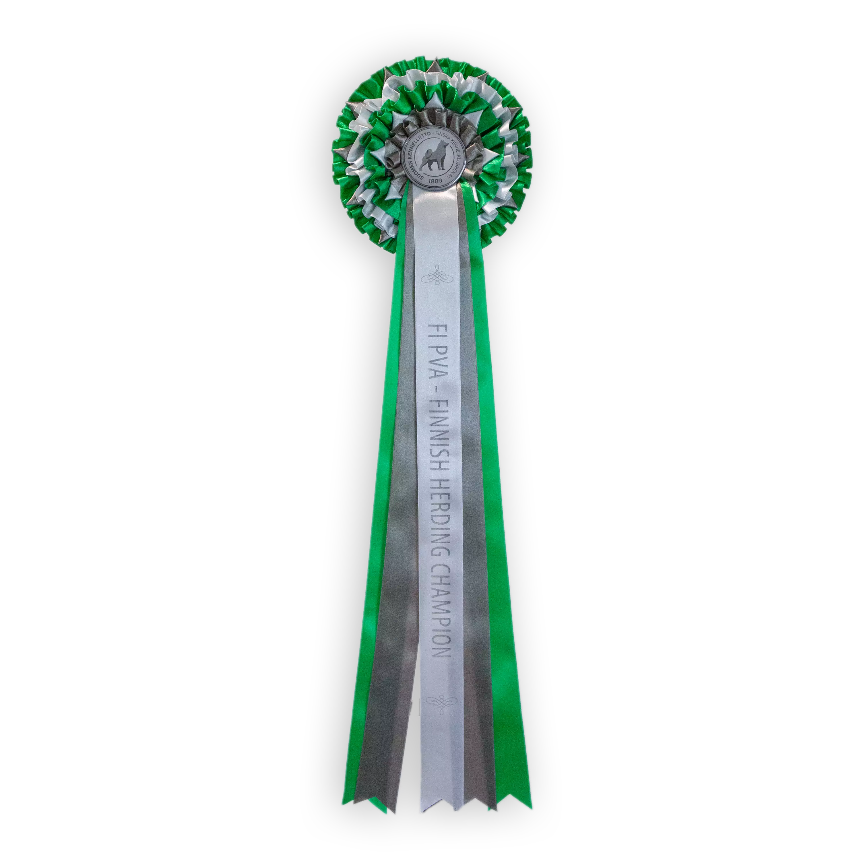FI PVA ruusuke on saanut uuden ihastuttavan mallin! Suomen Paimennusvalio ruusuke on halkaisijaltaan noin 18,5 cm ja siinä on 5 nauhaa, joiden pituus on noin 56 cm. Ruusukkeen takana on koukkukiinnitys. Metallisessa keskiössä on Kennelliiton logopainatus.