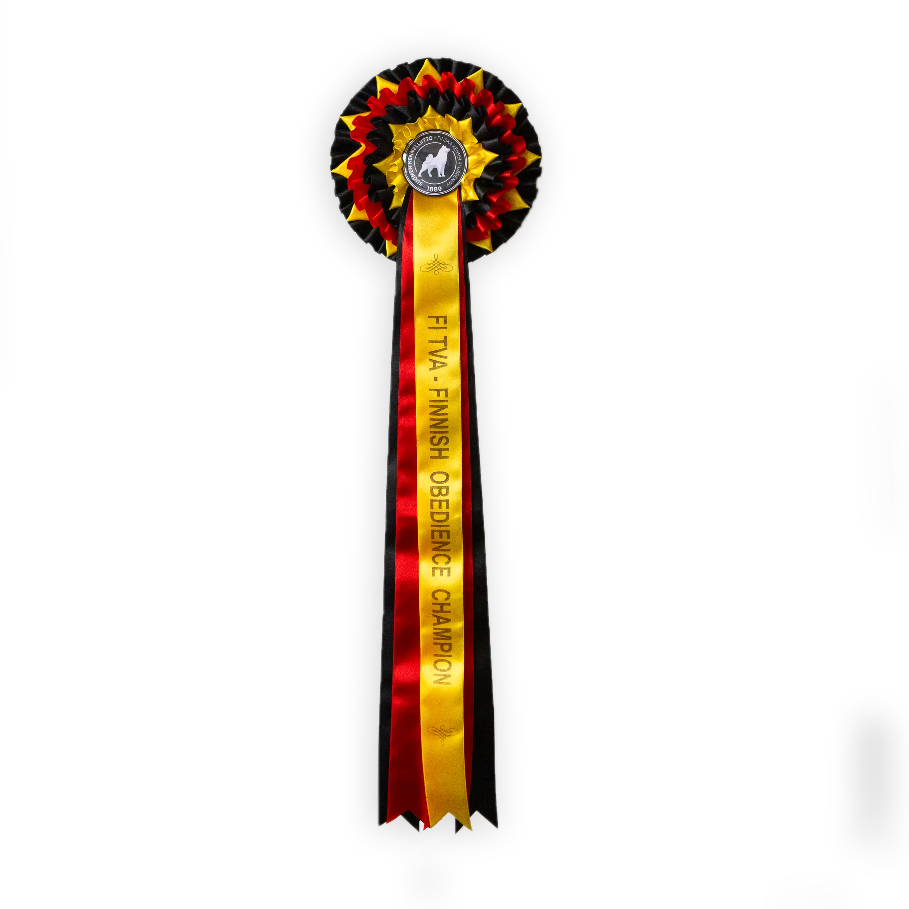 FI TVA ruusuke on saanut uuden mallin. Suomen Tottelevaisuusvalio ruusuke on halkaisijaltaan noin 18,5 cm ja siinä on 5 nauhaa, joiden pituus on noin 56 cm. Ruusukkeen takana on koukkukiinnitys. Metallisessa keskiössä on Kennelliiton logopainatus.