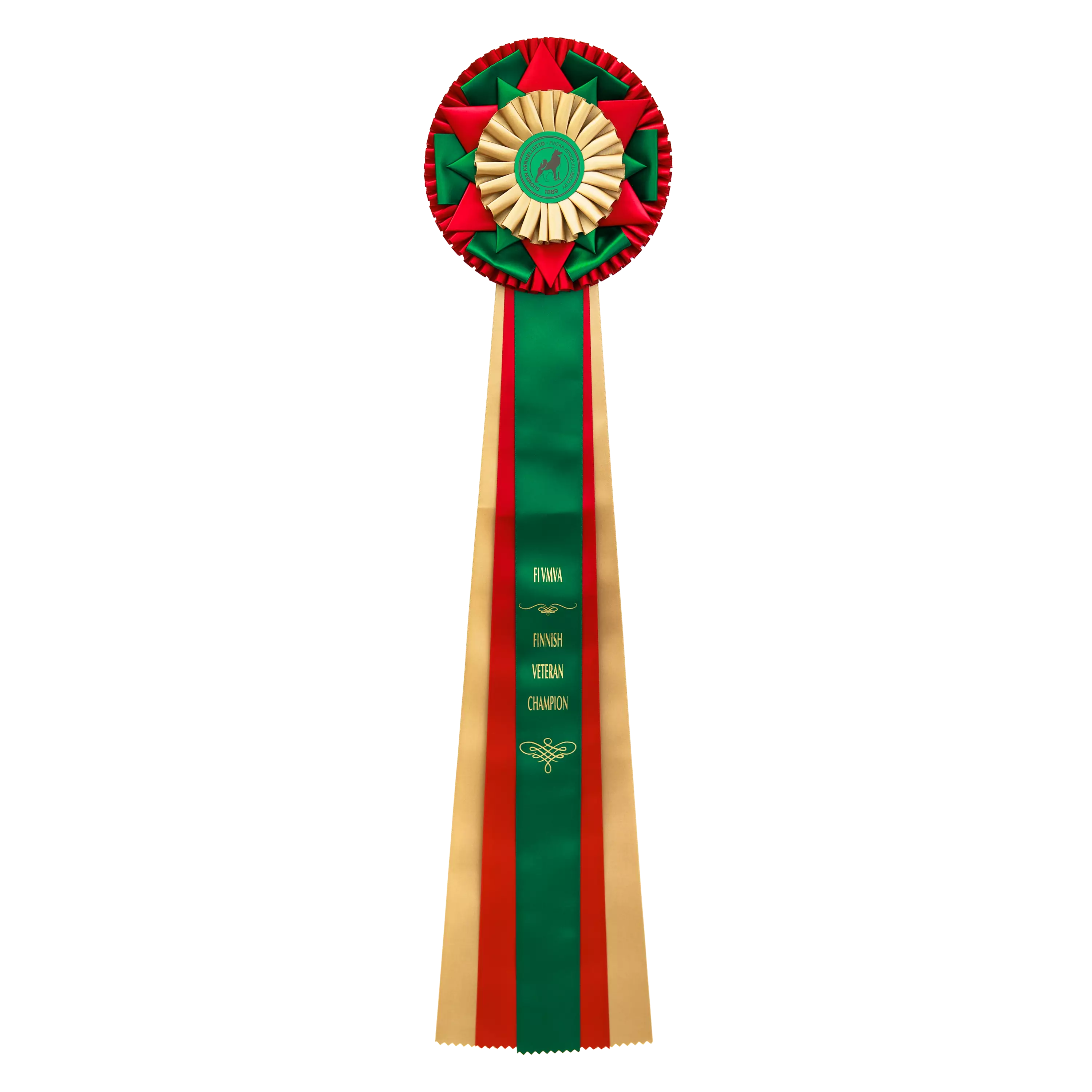 Upea FI VMVA ruusuke. Suomen veteraanimuotovalion ruusuke on halkaisijaltaan 17,5 cm ja siinä on viisi nauhaa, joiden pituus on noin 60 cm. Nauhoissa teksti on kultavärillä. Ruusukkeen materiaali on kiiltävä silkki. Takana koukkukiinnitys. Keskiössä Kennelliiton logopainatus.