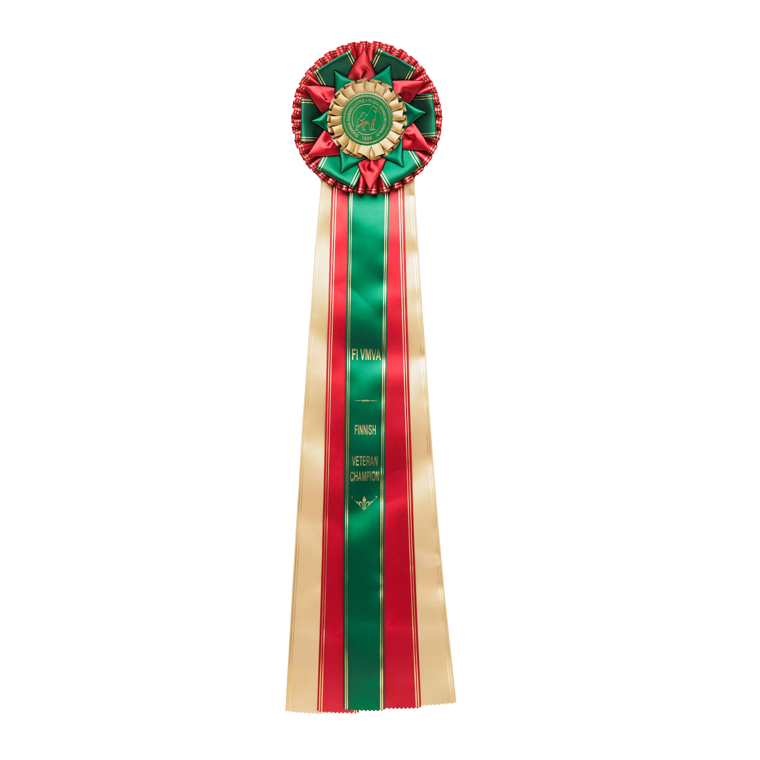 Upea FI VMVA ruusuke. Suomen veteraanimuotovalion ruusuke on halkaisijaltaan 16 cm ja siinä on viisi nauhaa, joiden pituus on 57 cm. Nauhoissa teksti on kultavärillä. Ruusukkeen materiaali on kiiltävä silkki. Takana koukkukiinnitys. Keskiössä kultavärillä Kennelliiton logo.