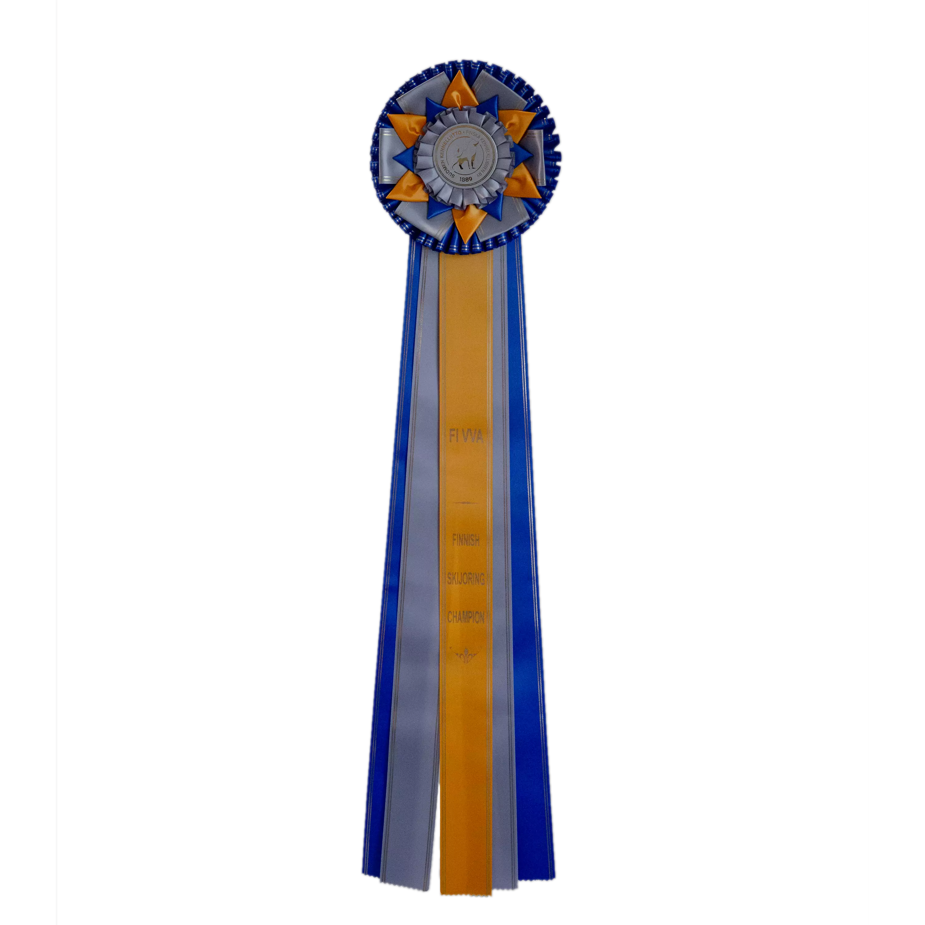 Upea FI VVA -ruusuke. Halkaisija 16 cm ja viisi nauhaa, joiden pituus 57 cm. Nauhoissa kultavärillä teksti. Ruusukkeen materiaali kiiltävä silkki. Takana koukkukiinnitys. Keskiössä kultavärillä Kennelliiton logo.