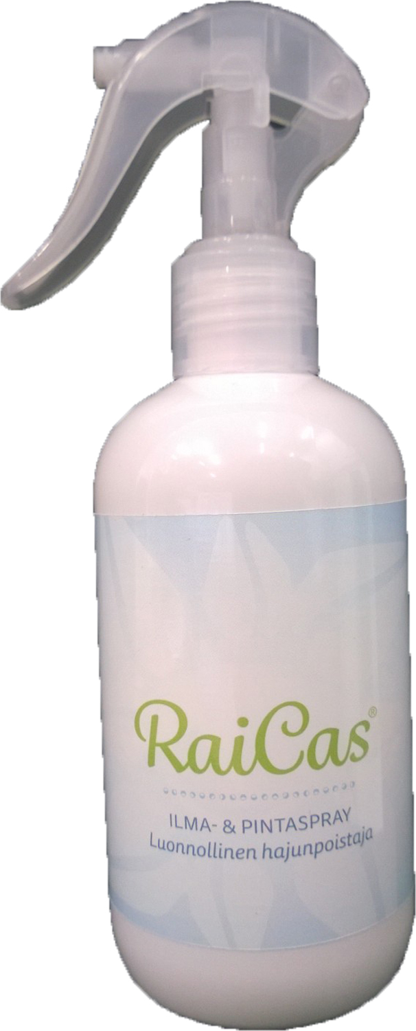 Hajunpoistospray Raicas 250ml. RaiCas® Ilma & Pinta Spray on luonnollisesti hajoava ja turvallinen molekyylikaappari, joka poistaa luonnollisesti epämiellyttävät hajut ilmasta, pinnoilta ja tekstiileistä.