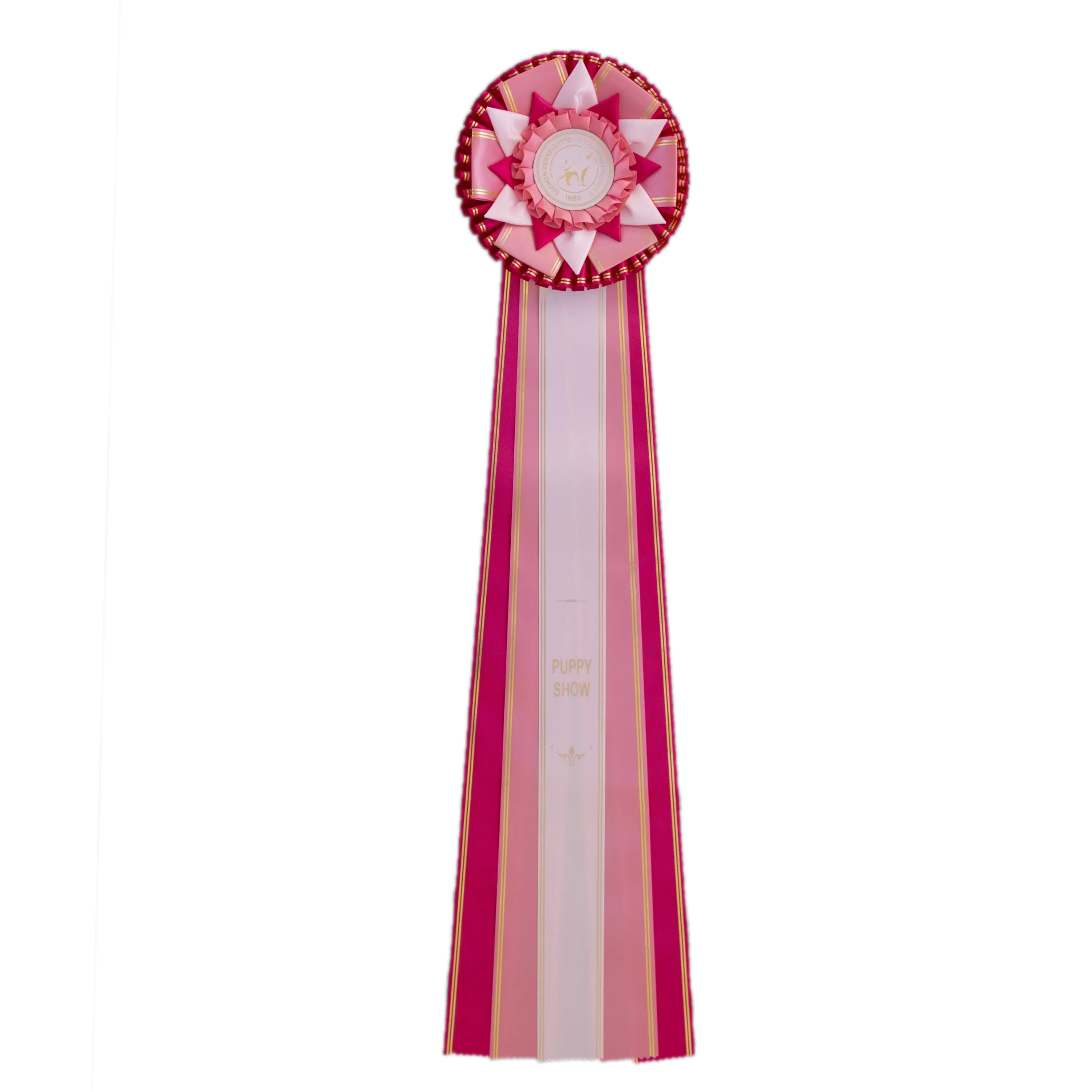 Upea Helsinki Puppy Show ruusuke vaaleanpuneisen eri sävyissä. Keskiön halkaisija n. 16 cm ja nauhojen pituus lähes 60 cm keskiön alareunasta .Takana koukkukiinnitys. Keskiössä Kennelliiton logo.