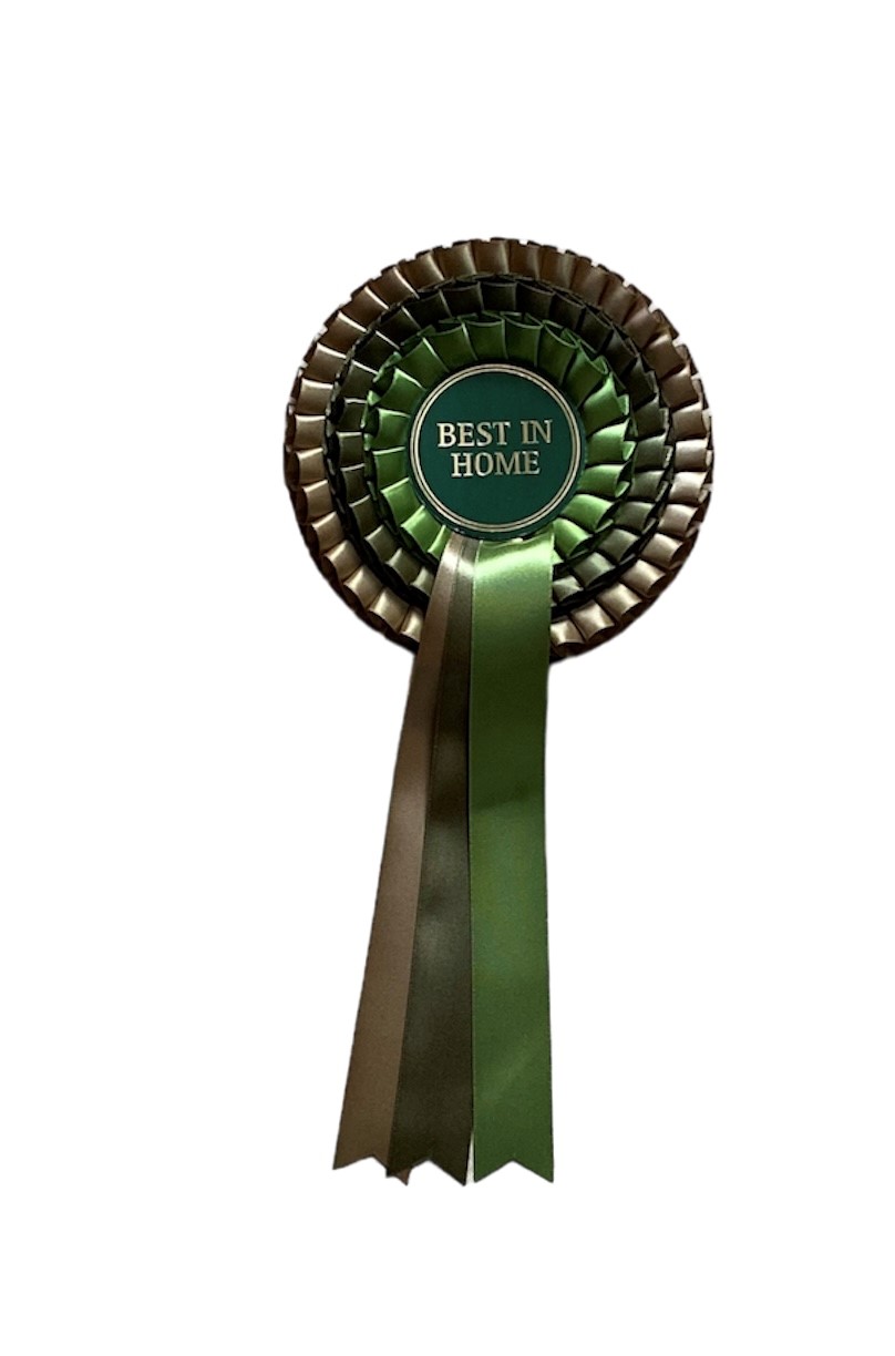 Ruusukkeen keskiössä teksti "BEST IN HOME". Ruusuke on 14 cm leveä, keskiön halkaisija on 5,9 cm ja kokonaispituus on 22,5 cm.