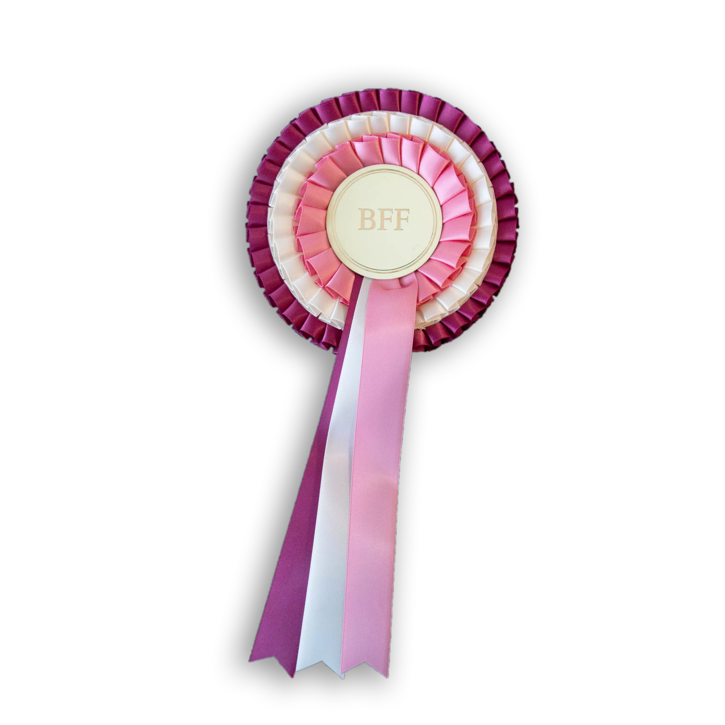 Ruusukkeen keskiössä teksti "BFF". Ruusuke on 14 cm leveä, keskiön halkaisija on 5,9 cm ja kokonaispituus on 22,5 cm.