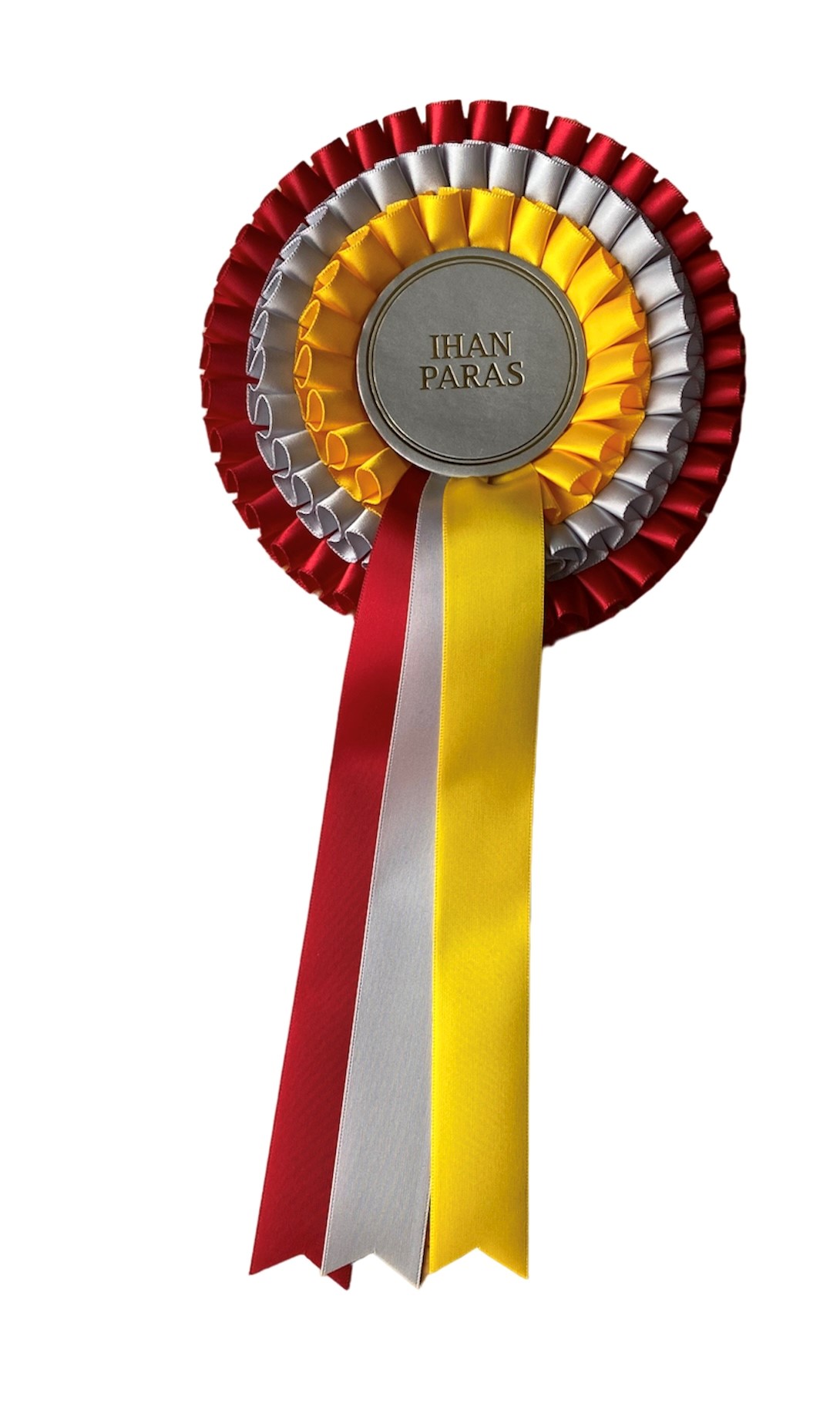 Monikäyttöinen hupiruusuke Ihan Paras-tekstillä. Punainen, hopeanharmaa ja keltainen muodostavat hienon kehyksen keskiöön kullalla painetulle tekstille. Ruusukkeen leveys on noin 13,5 cm ja sen pituus yhdessä nauhojen kanssa on noin 30 cm.
