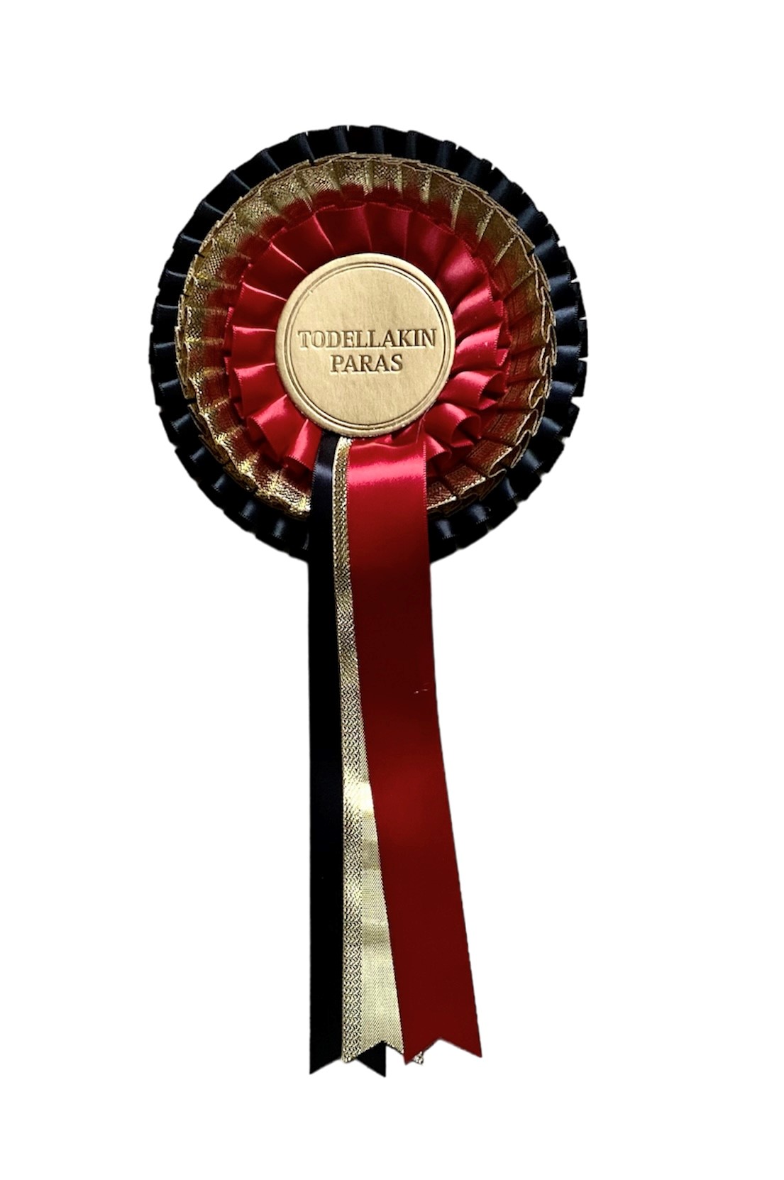 Ruusukkeen keskiössä teksti "TODELLAKIN PARAS" kultakirjaimin. Ruusuke on 14 cm leveä, keskiön halkaisija on 5,9 cm ja kokonaispituus on 22,5 cm. HUOM! T ällä hetkellä varastossa ruusuketta, jossa punaisen nauhan tilalla on hopeinen nauha!