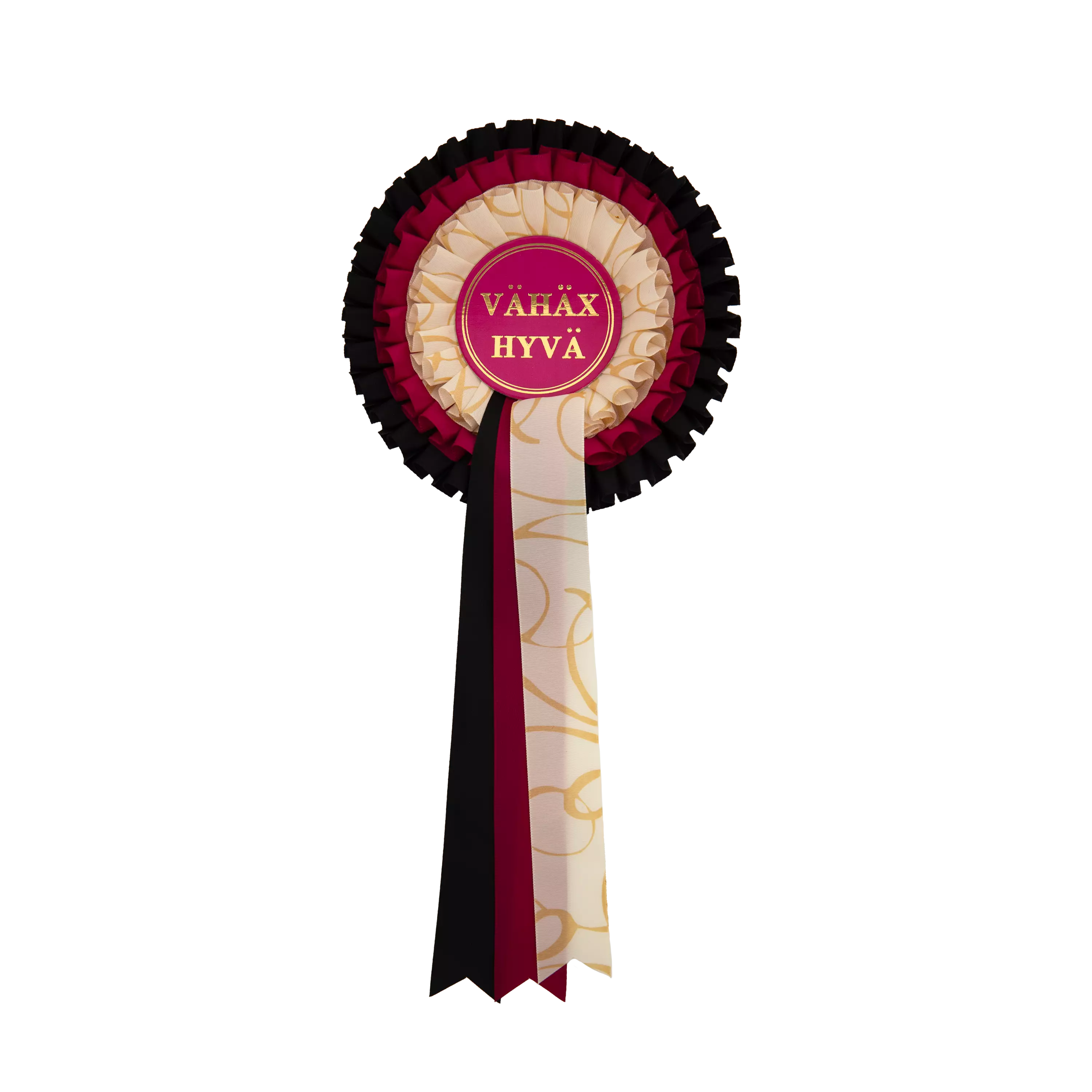 Ruusukkeen keskiössä teksti "VÄHÄX HYVÄ". Ruusuke on 14 cm leveä, keskiön halkaisija on 5,9 cm ja kokonaispituus on 22,5 cm.