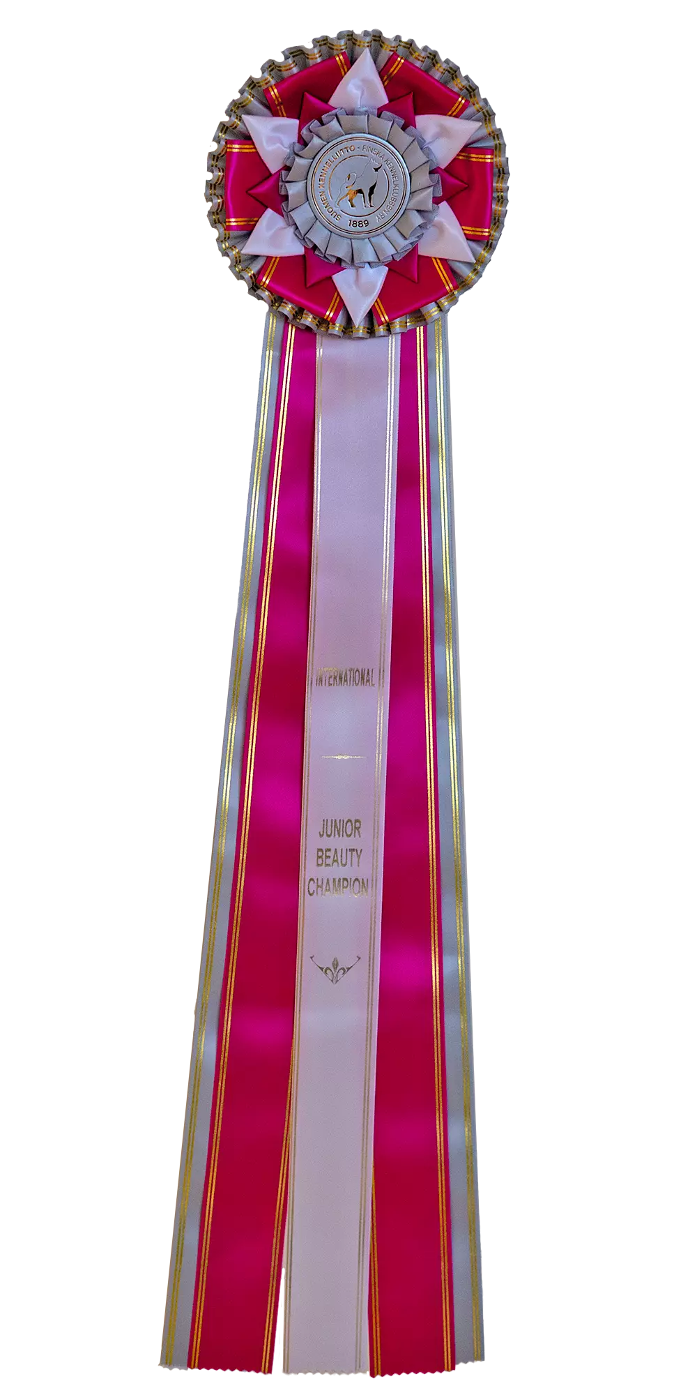 Upea International Junior Beauty Champion ruusuke. Ruusuke on halkaisijaltaan 16 cm ja siinä on viisi nauhaa, joiden pituus on noin 57 cm. Nauhoissa teksti on kultavärillä. HUOM! Kuvasta poiketen ruusukkeessa lukee C.I.B.-J International Junior Champion. Ruusukkeen materiaali on kiiltävä silkki. Takana koukkukiinnitys. Keskiössä Kennelliiton logopainatus.