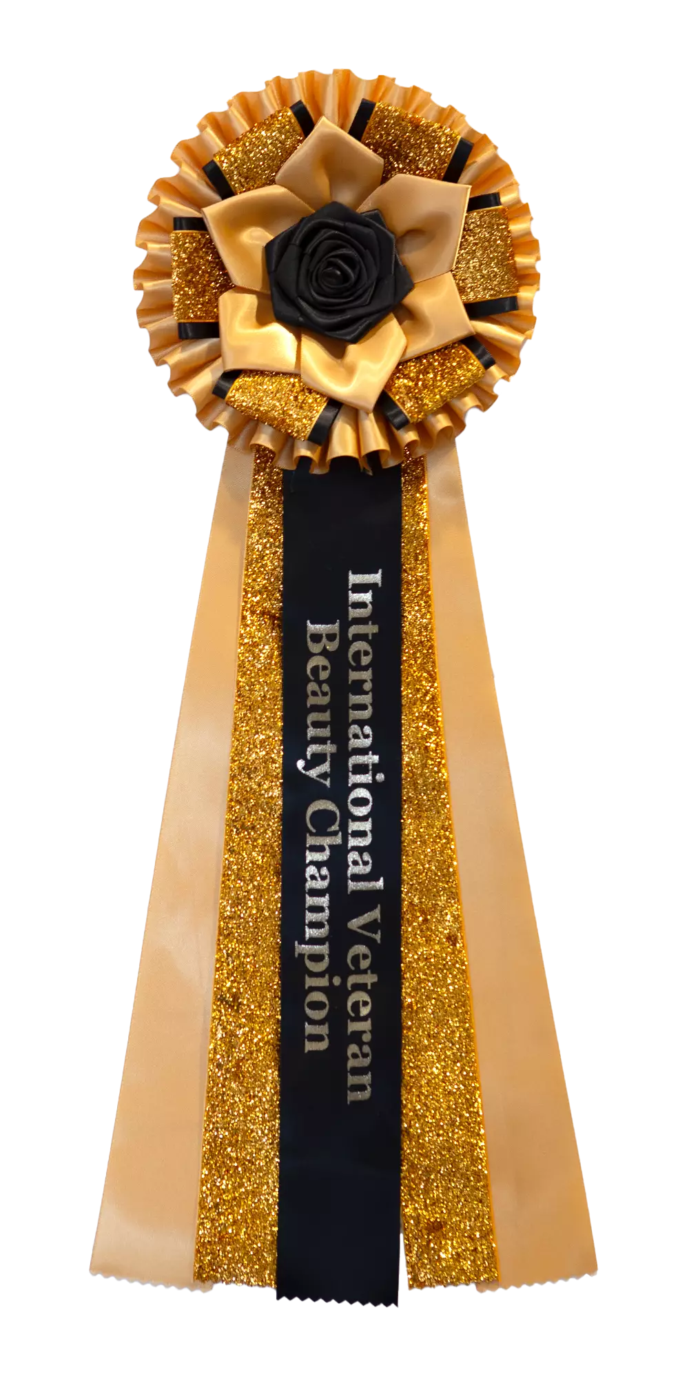Upea kullanhohtoinen glitterillä koristeltu International Veteran Beauty Champion -ruusuke. Ruusukkeen halkaisija on leveimmillään noin 16,5 cm ja kokonaispituus on noin 50 cm.