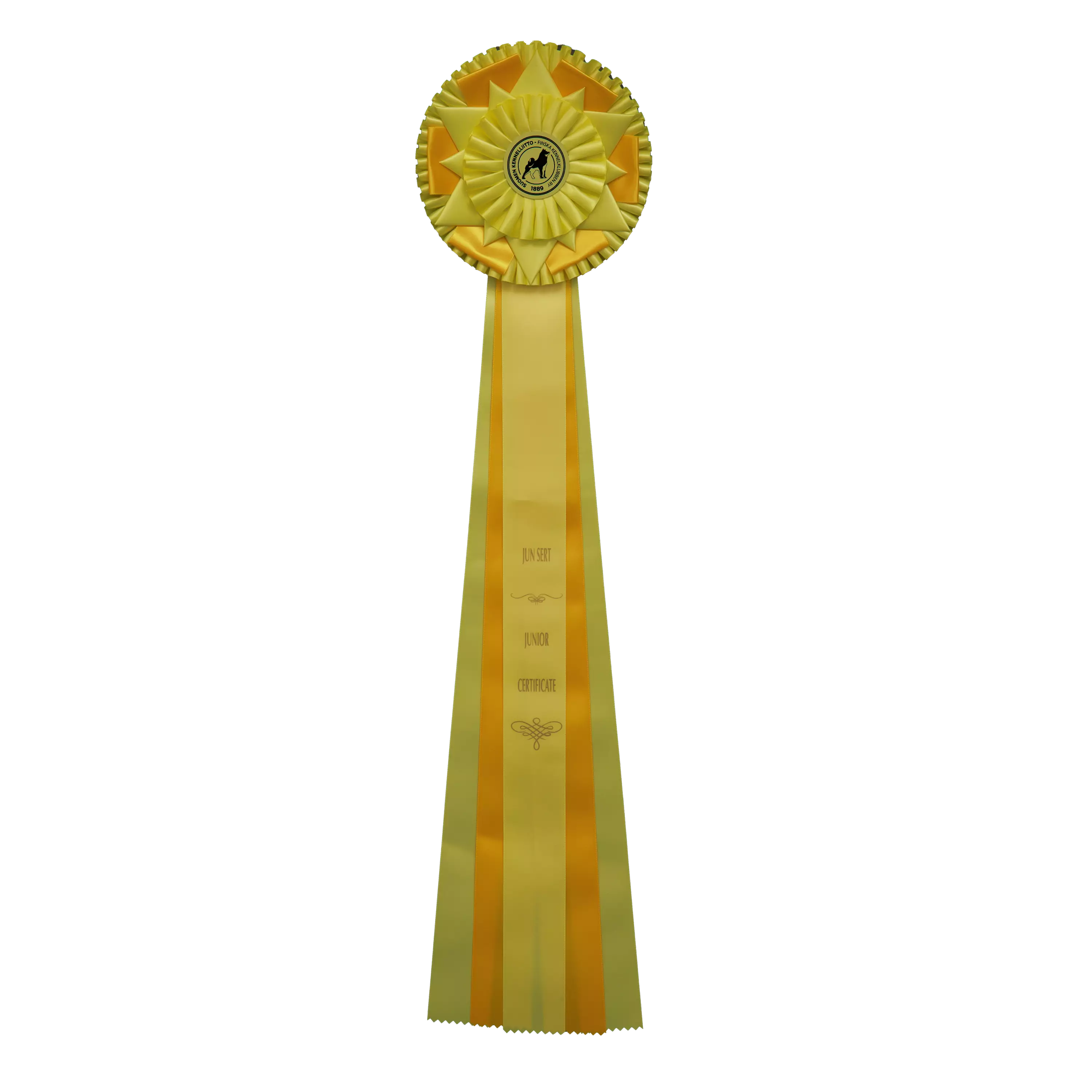 Iso JUN SERT ruusuke. Juniorisertifikaattiruusuke on halkaisijaltaan 17,5 cm ja siinä on viisi nauhaa, joiden pituus on noin 60 cm. Nauhoissa oleva teksti on kullanvärinen. Ruusukkeen materiaali on kiiltävä silkki. Takana koukkukiinnitys. Keskiössä Kennelliiton logopainatus.