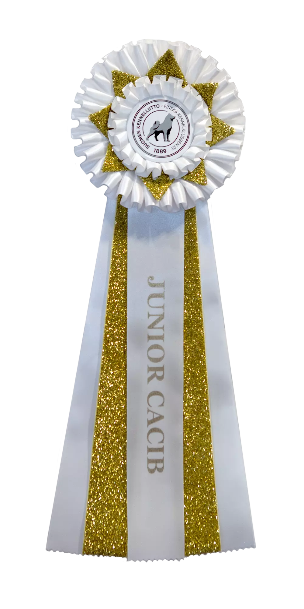 JUNIOR CACIB-ruusuke glitternauhalla. Ruusukkeen halkaisija on leveimmillään noin 14,5 cm ja kokonaispituus on noin 44 cm.
