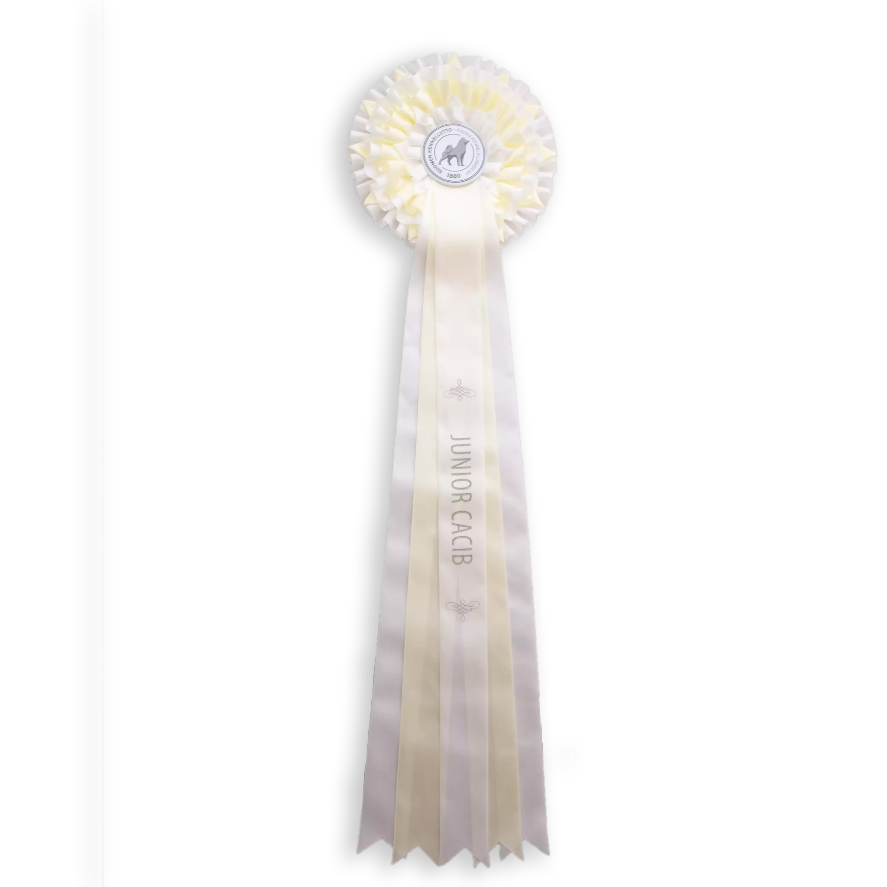JUNIOR CACIB ruusuke on saanut uuden ihastuttavan mallin! Junior cacib ruusuke on halkaisijaltaan noin 18,5 cm ja siinä on 5 nauhaa, joiden pituus on noin 56 cm. Ruusukkeen takana on koukkukiinnitys. Metallisessa keskiössä on Kennelliiton logopainatus.