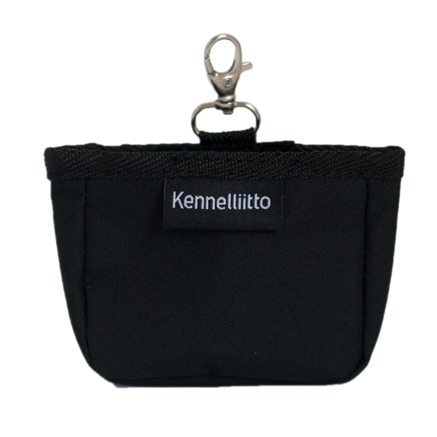 A small pouch where you can keep treats for your dog easily accessible. Keeps your pockets dry and odor free. Inside material easy to keep clean. Attaches easily to your belt loop. Black, with The Finnish Kennel Clubs logo on it.