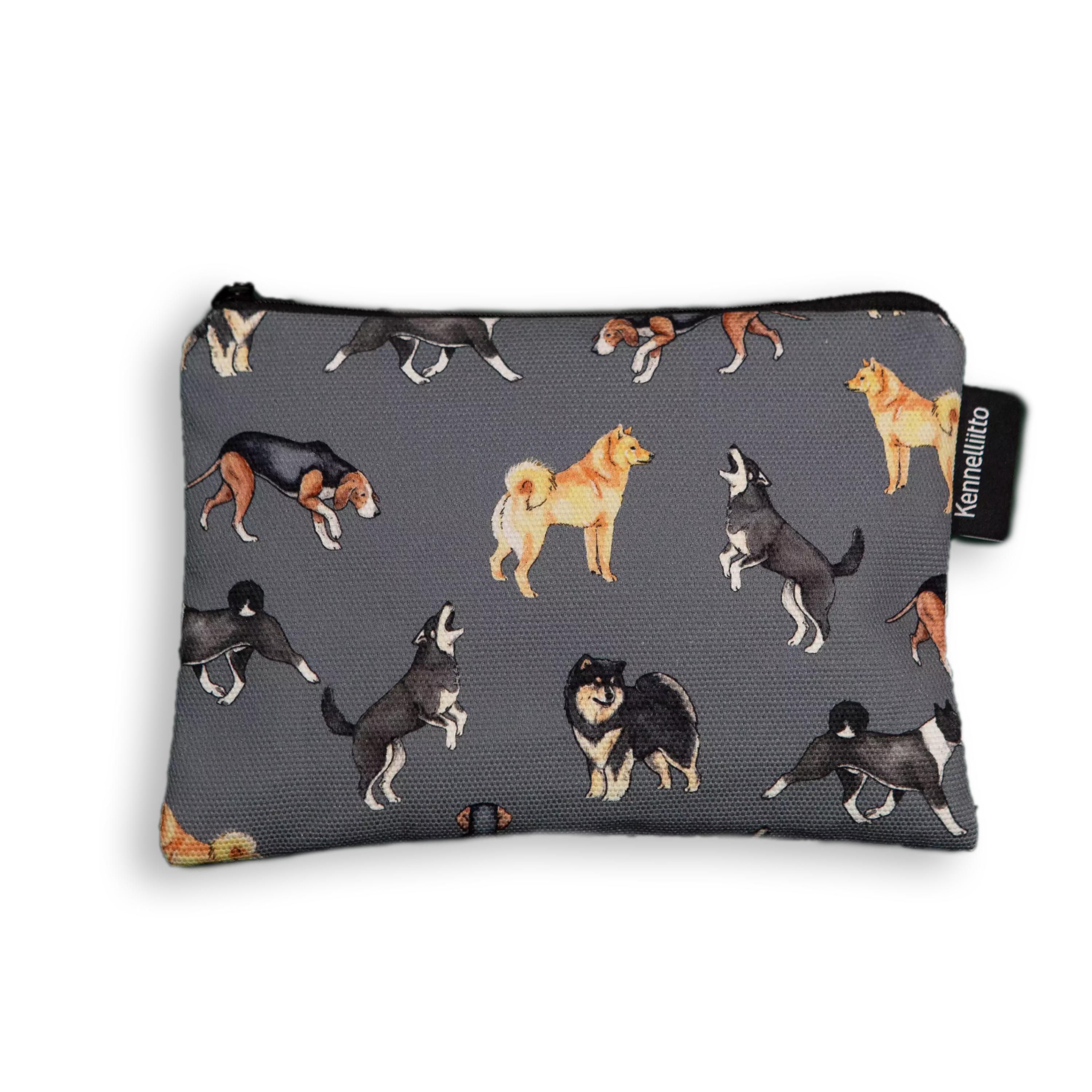 Kotimaisilla roduilla kuvitettu pikkupussukka on pieni tilaihme erilaisiin säilytystarpeisiin. Vetoketjullinen pussukka on valmistettu puuvillacanvaksesta ja siinä seikkailevat kotimaisten rotujen koirat harmaalla taustalla. Pussukan sivuun on ommeltu Kennelliiton kangasmerkki. Pikkupussukka toimii pienenä meikkipussina, penaalina ja vaikkapa koiran tarvikkeillekin. Nämä sopivat myös isomman laukun järjestyksen ylläpitoon loistavasti. Näin tärkeimmät tavarat löytyvät helposti ja laukussa säilyy järjestys.