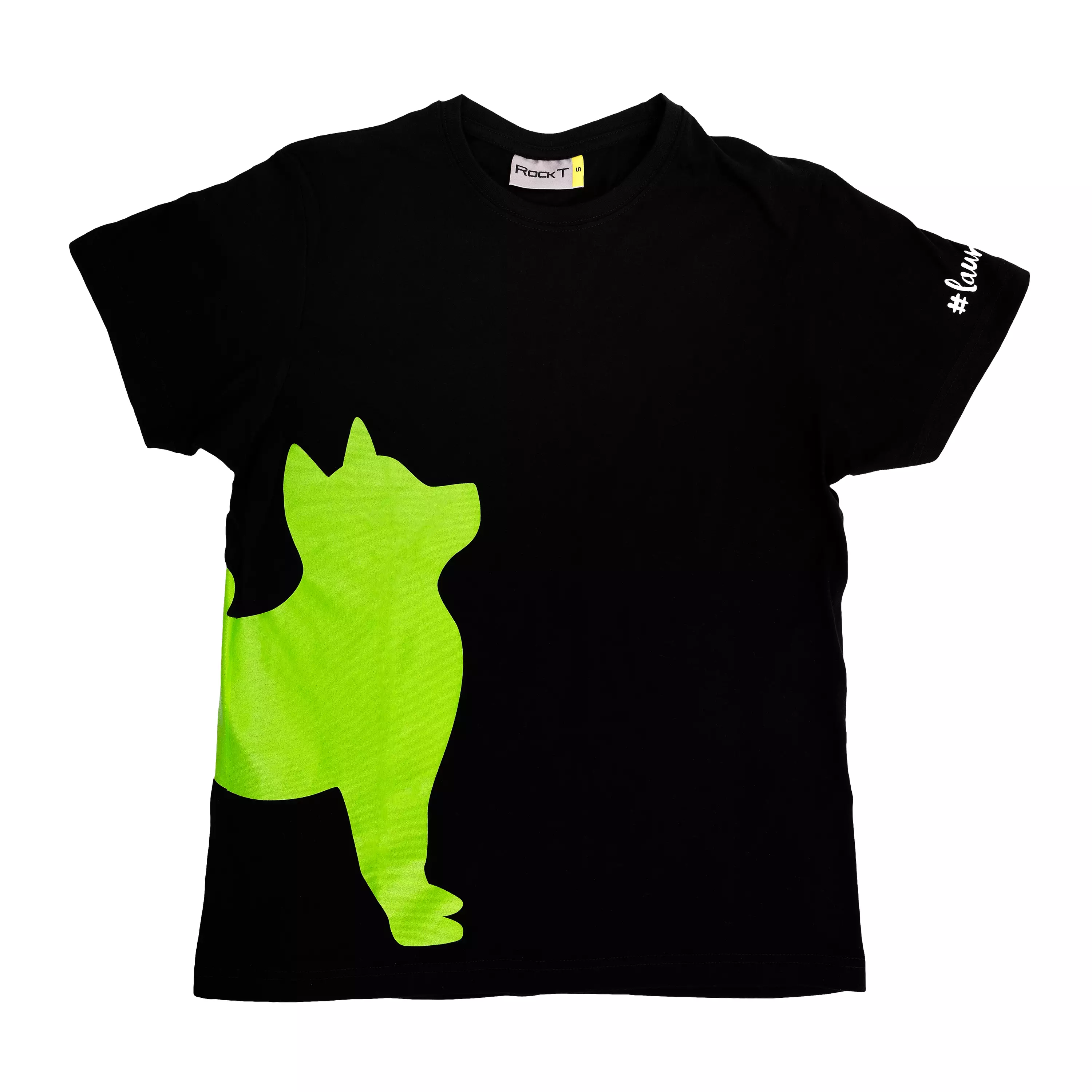 #laumassa t-paita on suunniteltu nuorille koiraharrastajille ja toki myös nuorten mielisille. Paidan vasempaan hihaan on painettu #laumassa logo valkoisella. Paidan oikeaa kylkeä koristaa ihana limen värinen koirahahmo, joka on tuttu Kennelliiton Nuorten logosta. Koiran etuosa on paidan etuuolella ja häntä löytyy paidan takaa.