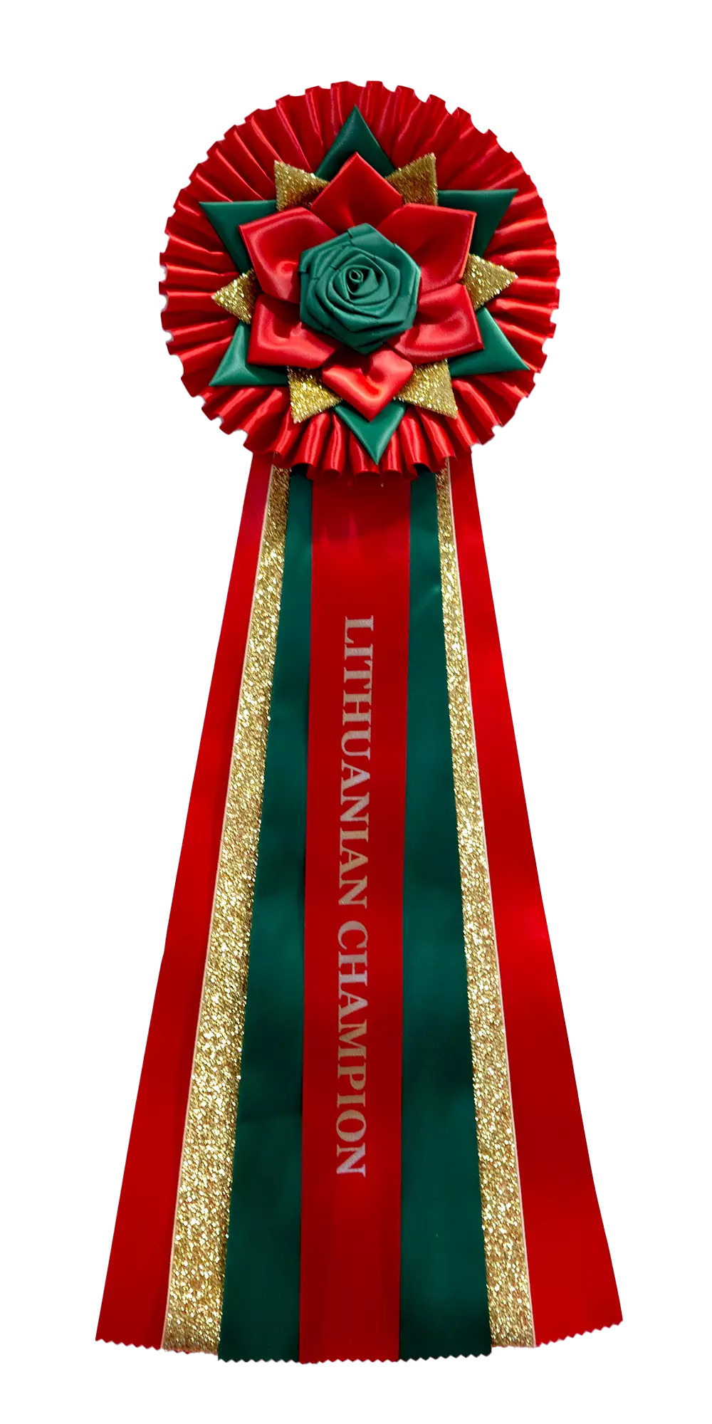 Ihana Lithuanian Champion -ruusuke. Ruusukkeen halkaisija on leveimmillään noin 19 cm ja kokonaispituus on noin 60 cm.