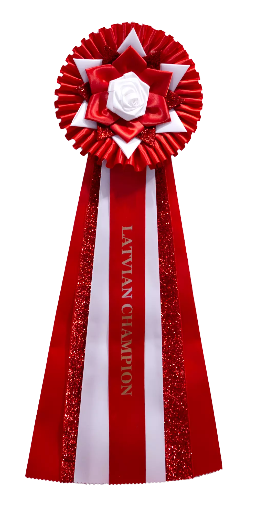 Ihana Latvian Champion -ruusuke. Ruusukkeen halkaisija on leveimmillään noin 19 cm ja kokonaispituus on noin 60 cm.
