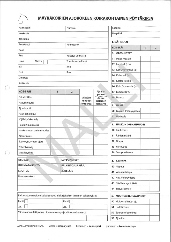 Mäyräkoirien ajokokeen (MÄAJ) pöytäkirja.
