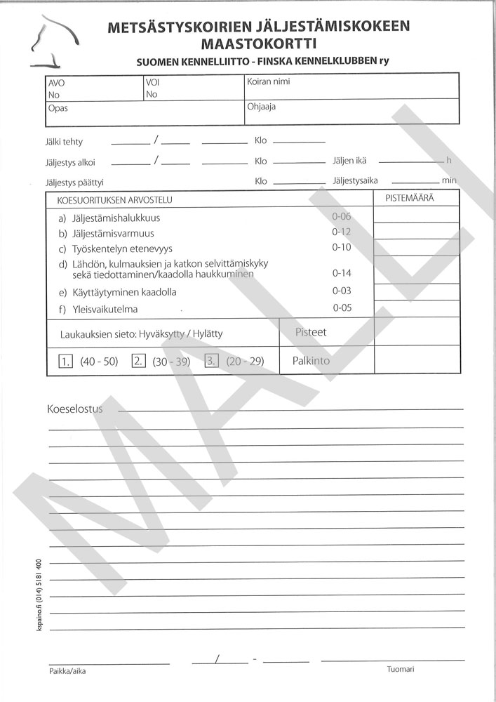 Metsästyskoirien jäljestämiskokeen (MEJÄ) maastokortti.