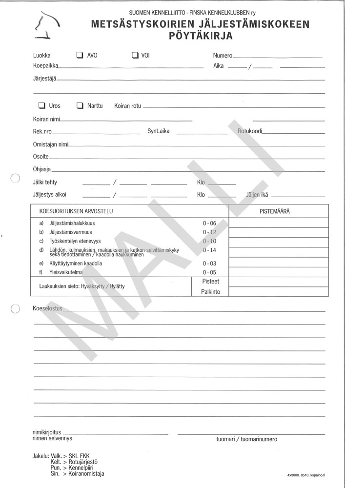 Metsästyskoirien jäljestämiskokeen (MEJÄ) pöytäkirja.