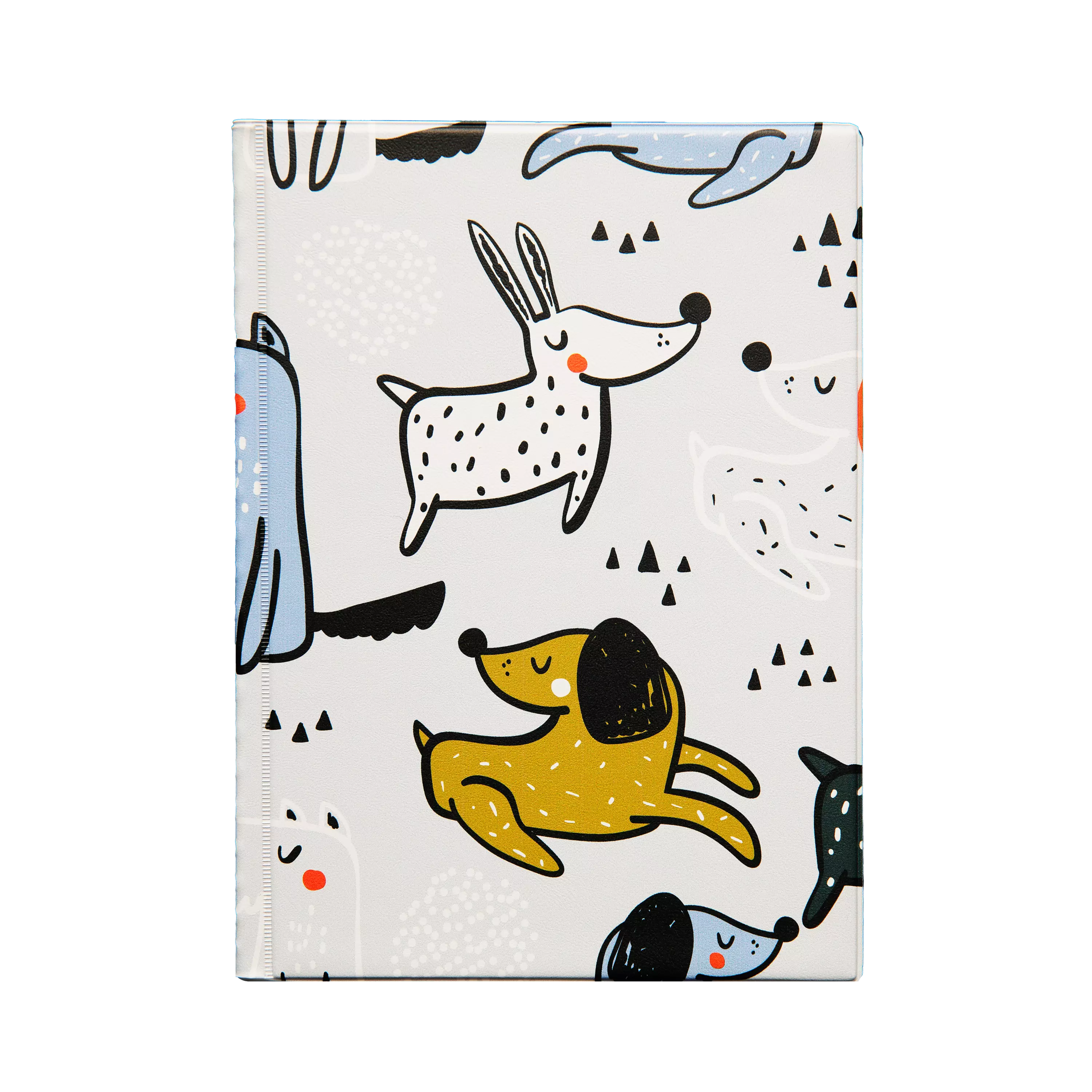 Näyttelykansio on kooltaan A5 ja siinä on 4 kpl A4 (taitettu) ja 4 kpl A5 kokoisia taskuja. Kannen materiaali on muovia.