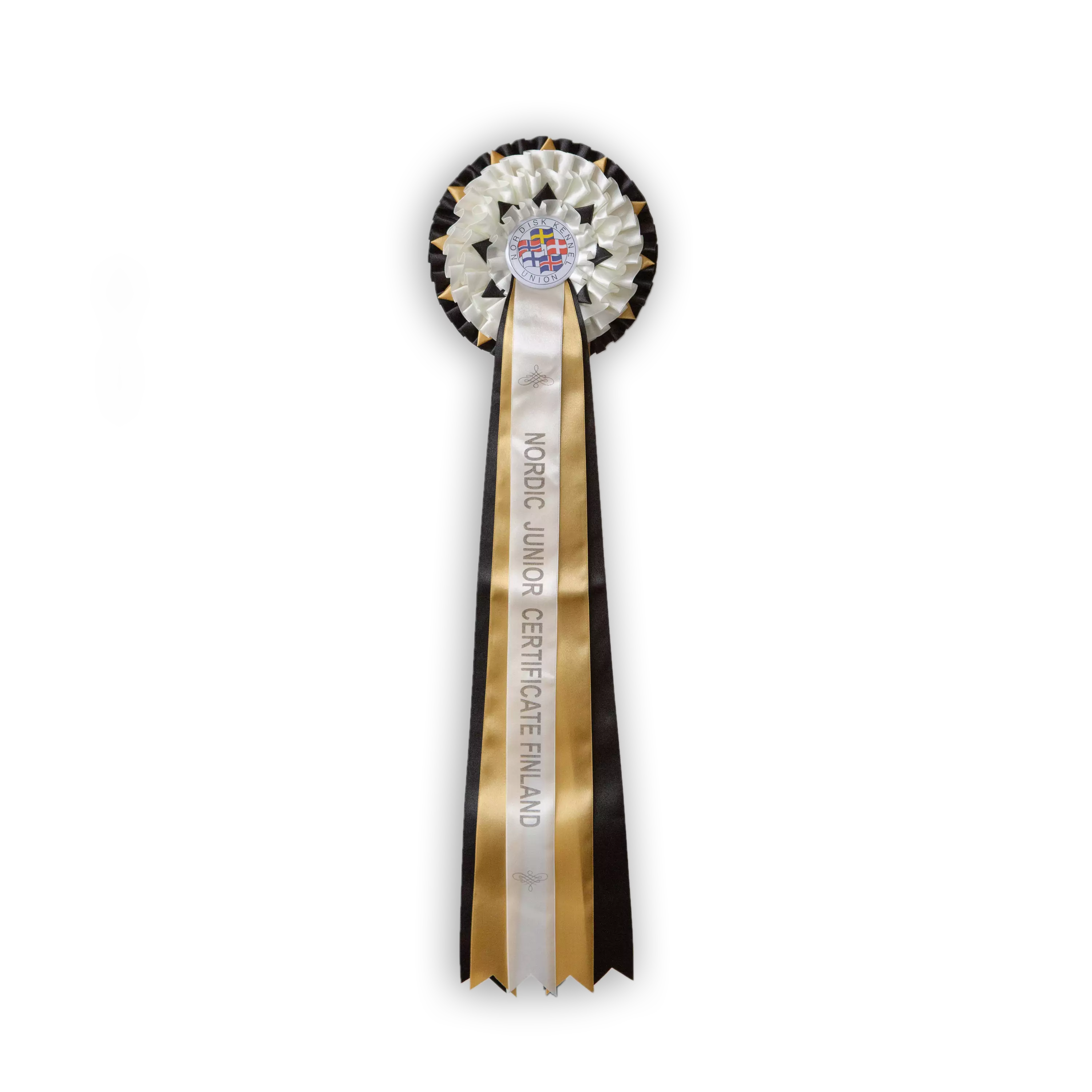 Iso NORDIC JUN SERT -ruusuke on saanut uuden mallin. Ruusuke on halkaisijaltaan noin 18,5 cm ja siinä on 5 nauhaa, joiden pituus on noin 56 cm. Ruusukkeen takana on koukkukiinnitys. Metallisessa keskiössä on Nordisk Kennelu Union logopainatus.