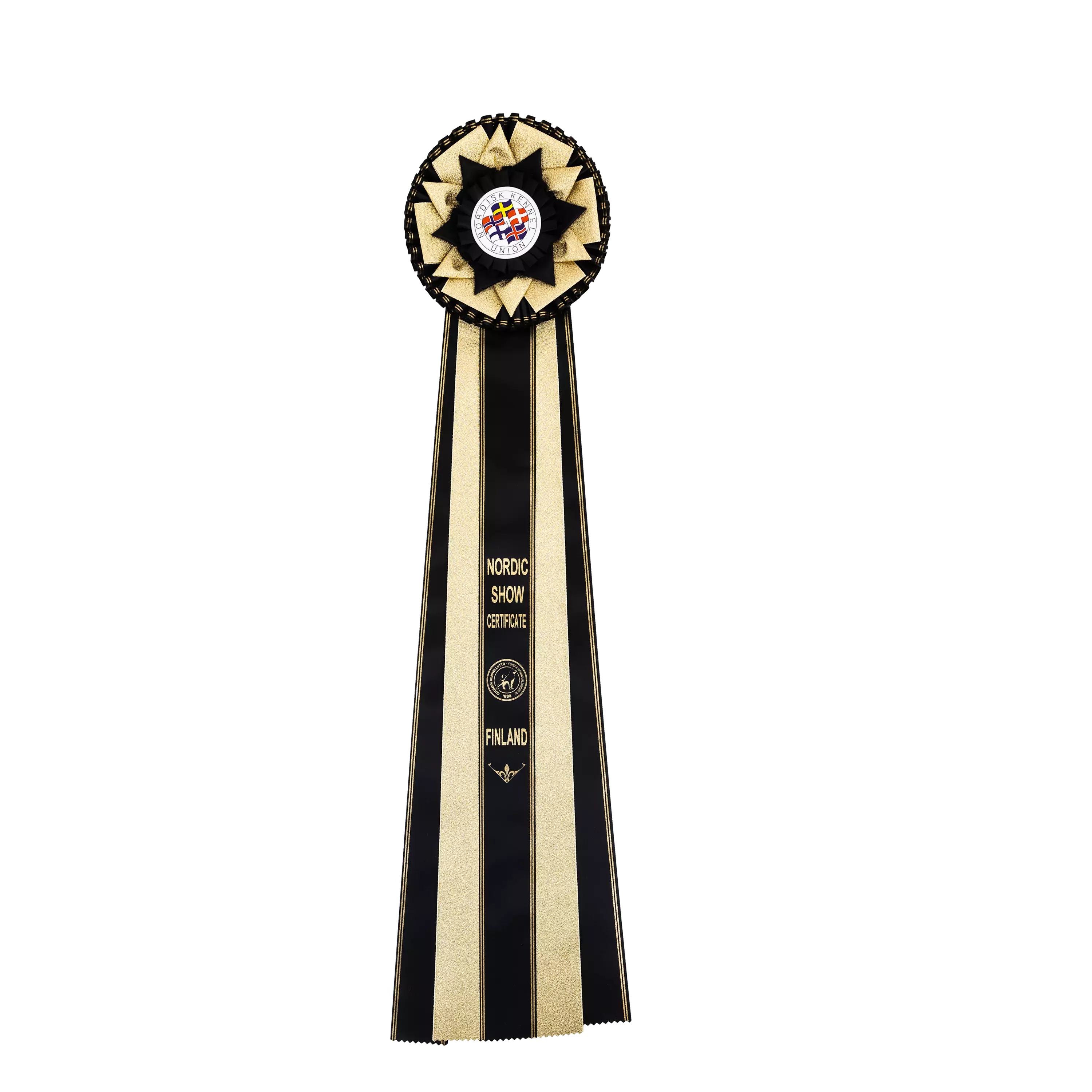 Upea Nordic Show Certificate Finland- ruusuke, jossa kultaisten nauhojen säihke pääsee oikeuksiinsa musta nauhan kanssa. HUOM! ruusukkeiden uusimmassa varastoon saapuneessa erässä kullan väriset nauhat ovat enemmän punertavat.