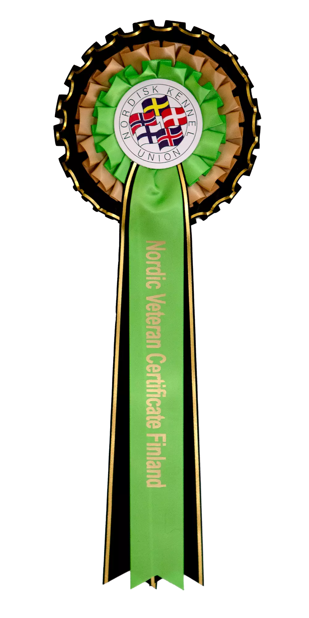 Nordic Veteran Certificate Finland -ruusuke on valmistettu kiiltävästä silkistä käsin ommeltuna. Takana hakaneulakiinnitys ja keskiössä Nordisk Kennel Union -logo. Ruusukkeen halkaisija on noin 14,5 cm ja siitä laskeutuu kolme nauhaa, joiden pituus on noin 28 cm.