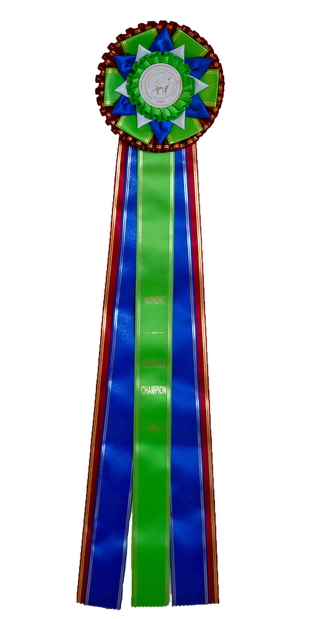 Nordic Veteran Champion -ruusuke. Halkaisija 16 cm ja viisi nauhaa, joiden pituus noin 57 cm. Nauhaoissa teksti Nordic Junior Champion. Ruusukkeen materiaali napakka, kiiltävä silkki. Takana koukkukiinnitys. Keskiössä Suomen Kennelliiton logo.