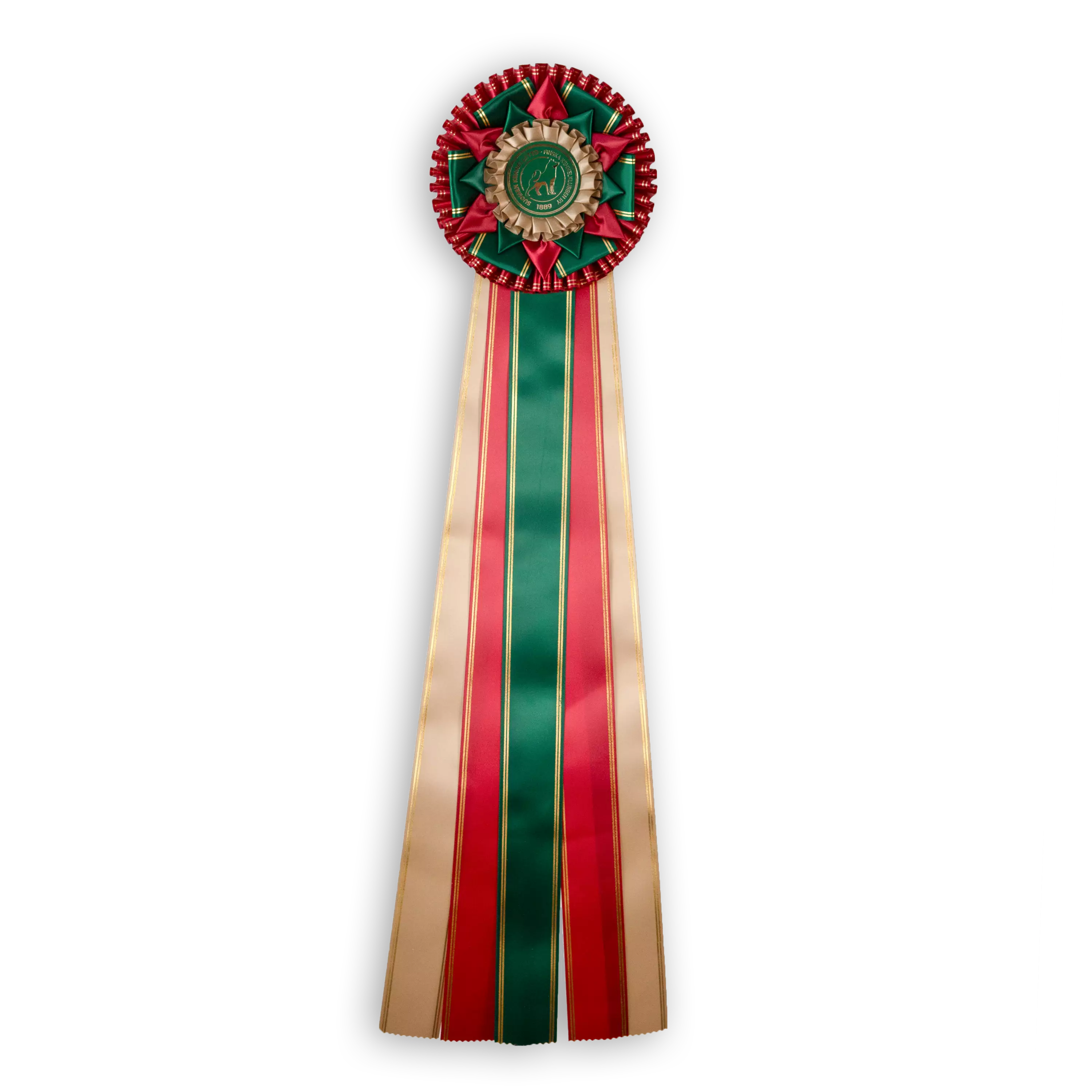 Upea Suomen veteraanimuotovalioruusuke omalla kullanvärisellä painatuksella. Keskiössä Suomen Kennelliiton pyöreä logo kultaisella painatuksella. Oman tekstin maksimipituus on 60 merkkiä jaettuna viidelle riville. Yhden rivin maksimi merkkimäärä on 12. Kirjoita haluamasi teksti tilauksen "Lisätietoja"- tai toimituksen yhteydessä oleva "vapaamuotoinen viesti tilaukseesi liittyen"- kenttään ja jaa teksti eri riveille /- merkin avulla. Muista, että ruusukkeessa ei ole valmiina valiopainatusta (FI VMVA / FI VCH / Suomen veteraanimuotovalio / Finnish veteran champion), joten huomioi merkki- ja rivimäärissä ne. HUOM! Painatus tehdään vain päällimmäiseen nauhaan. Muista kertoa myös missä muodossa haluat "valiotekstin". Ruusukkeen toimitusaika noin 2 viikkoa!