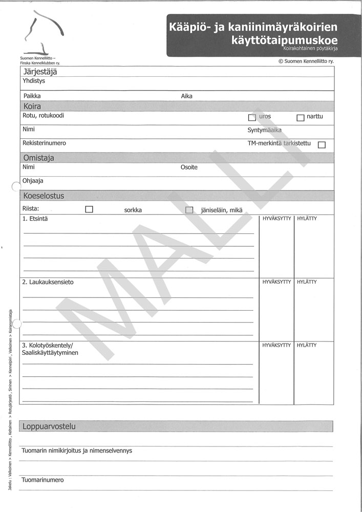 Pienoismäyräkoirien käyttötaipumuskokeen (PIKA) pöytäkirja.
