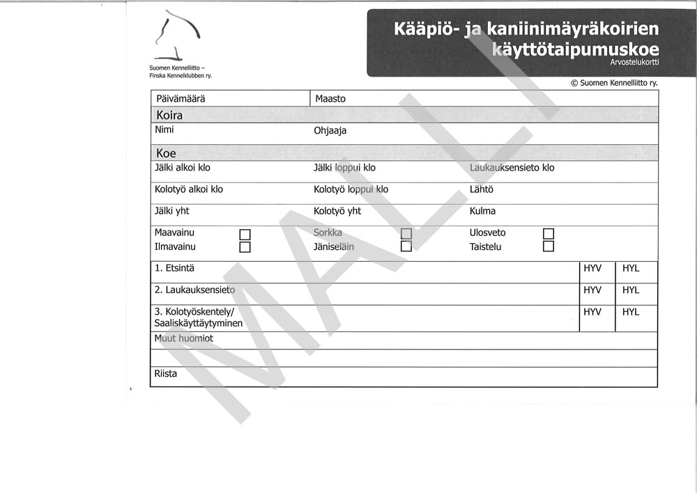 Pienoismäyräkoirien käyttötaipumuskokeen (PIKA) maastokortti.