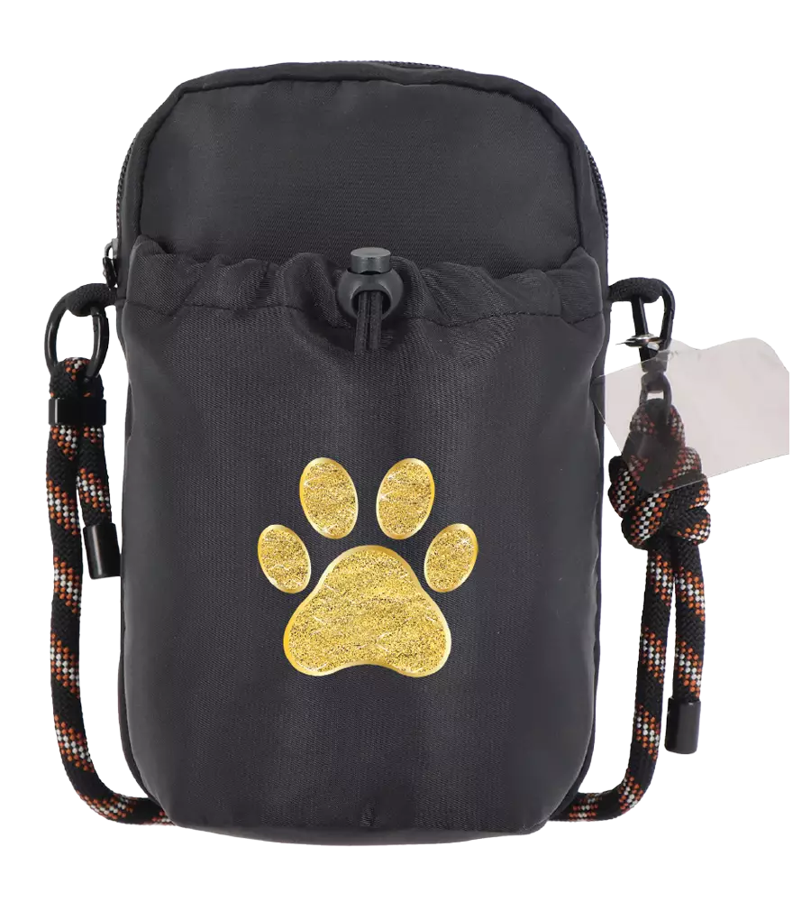 Monipuolinen pikkukassi sopii täydellisesti puhelimen, avainten ja vaikka lompakon kuljettamiseen. Kassin etuosassa on tasku kiristysnuoralla, joka sopii täydellisesti vesipullolle ja miksei vaikkapa koiran makupaloillekin. Isommassa taskussa on vetoketju. Etummaista taskua koristaa ihana tassukuva.